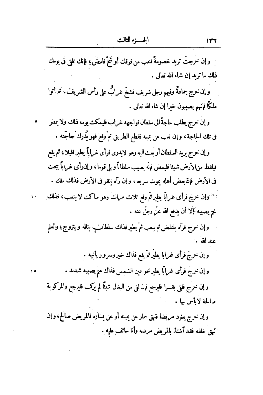 وإن خرج يريد السلطان أو بعث اليه وهو لا يدرى فرأى غرابا يطير قليلا؛ ثم يقع فيلقط من الأرض شيئا فليمض فإنّه يصيب سلطانا ويلى قوما، وإن رأى غرابا يبحث فى الأرض فإنّ بعض أهله يموت سريعا، وإن رآه ينقر في الأرض فذلك ملك.