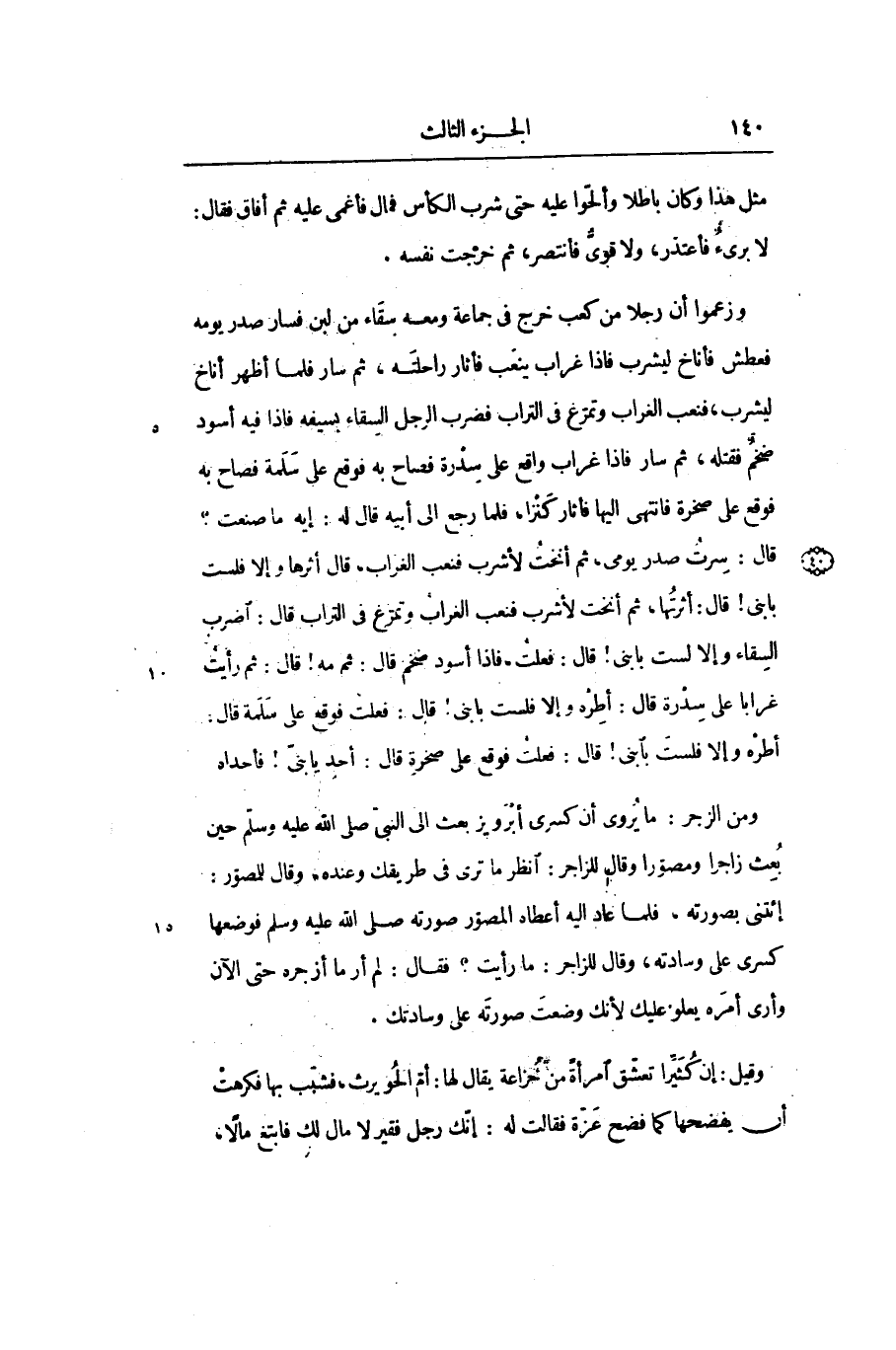 قال: سرت صدر يومى، ثم أنخت لأشرب فنعب الغراب، قال أثرها وإلا فلست يا بنى! قال: أثرتها، ثم أنخت لأشرب فنعب الغراب وتمرّغ في التراب قال: اضرب السقاء وإلا لست يا بنى! قال: فعلت، فاذا أسود ضخم قال: ثم مه! قال: ثم رأيت غرابا على سدرة قال: أطره وإلا فلست يا بنى! قال: فعلت فوقع على سلمة قال: