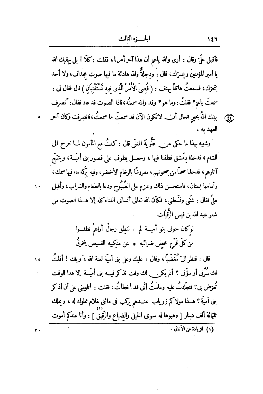 وشبيه بهذا ما حكى عن علّوية المغنىّ قال: كنت مع المأمون لما خرج الى الشام، فدخلنا دمشق فطفنا فيها، وجعل يطوف على قصور بنى أميّة، ويتتبّع آثارهم، فدخلنا صحنا من صحونهم، مفروشا بالرخام الأخضر، وفيه بركة ماء فيها سمك، وأمامها بستان، فاستحسن ذلك وعزم على الصّبوح ودعا بالطعام والشراب، وأقبل علىّ فقال: غنّنى ونشّطنى، فكأنّ الله تعالى أنسانى الغناء كله إلا هذا الصوت من شعر عبد الله بن قيس الرّقيّات