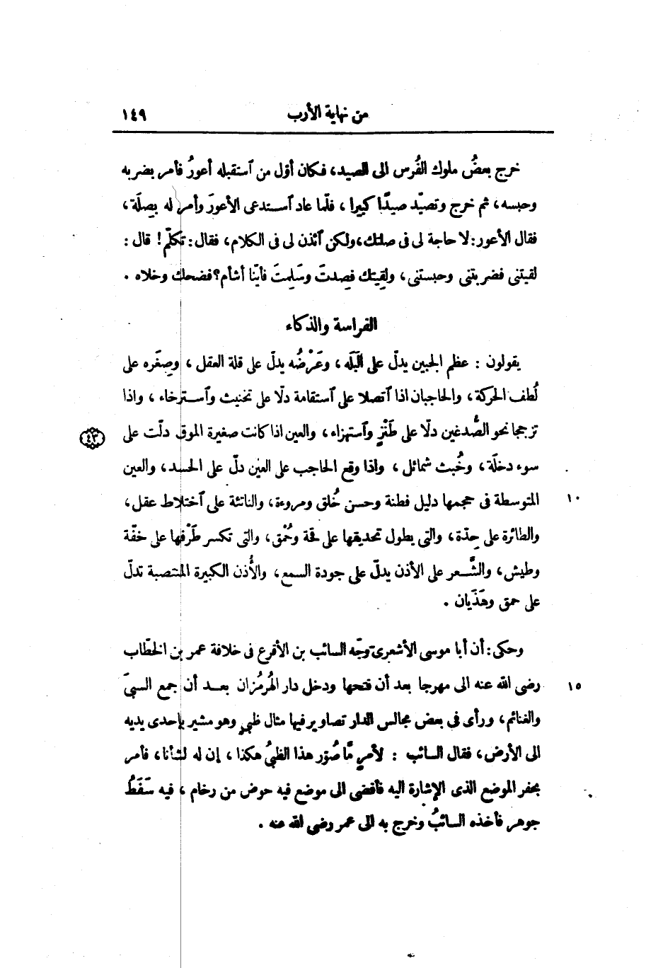 وحكى: أن أبا موسى الأشعرىّ وجّه السائب بن الأقرع في خلافة عمر بن الخطّاب رضى الله عنه الى مهرجا بعد أن فتحها ودخل دار الهرمزان بعد أن جمع السبى والغنائم، ورأى في بعض مجالس الدار تصاوير فيها مثال ظبى وهو مشير بإحدى يديه الى الأرض، فقال السائب: لأمر ما صوّر هذا الظبى هكذا، إن له لشأنا، فأمر بحفر الموضع الذى الإشارة اليه فأفضى الى موضع فيه حوض من رخام، فيه سفط جوهر فأخذه السائب وخرج به الى عمر رضى الله عنه.