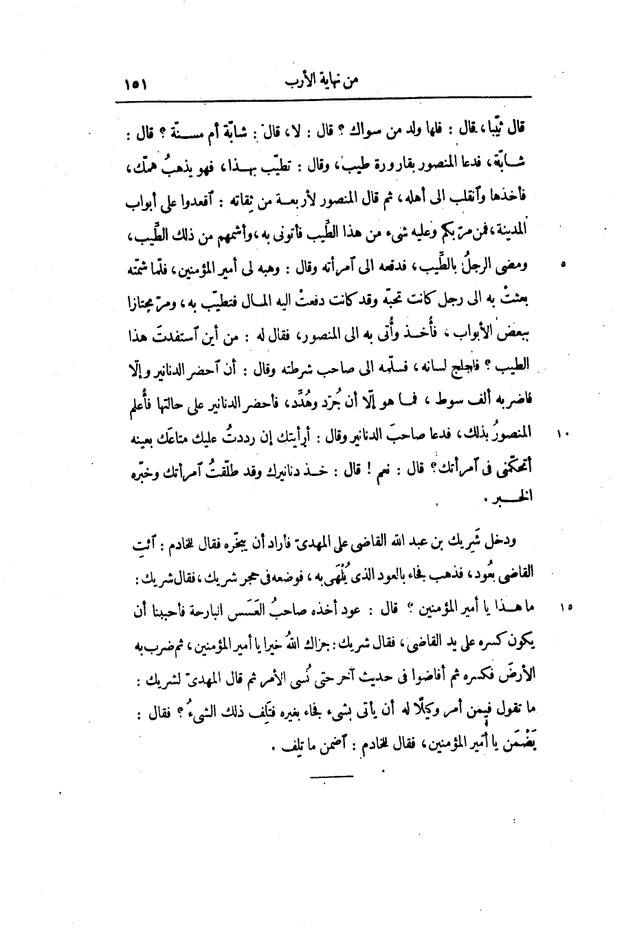 ما هذا يا أمير المؤمنين؟ قال: عود أخذه صاحب العسس البارحة فأحببنا أن يكون كسره على يد القاضى، فقال شريك: جزاك الله خيرا يا أمير المؤمنين، ثم ضرب به الأرض فكسره ثم أفاضوا في حديث آخر حتى نسى الأمر ثم قال المهدىّ لشريك: