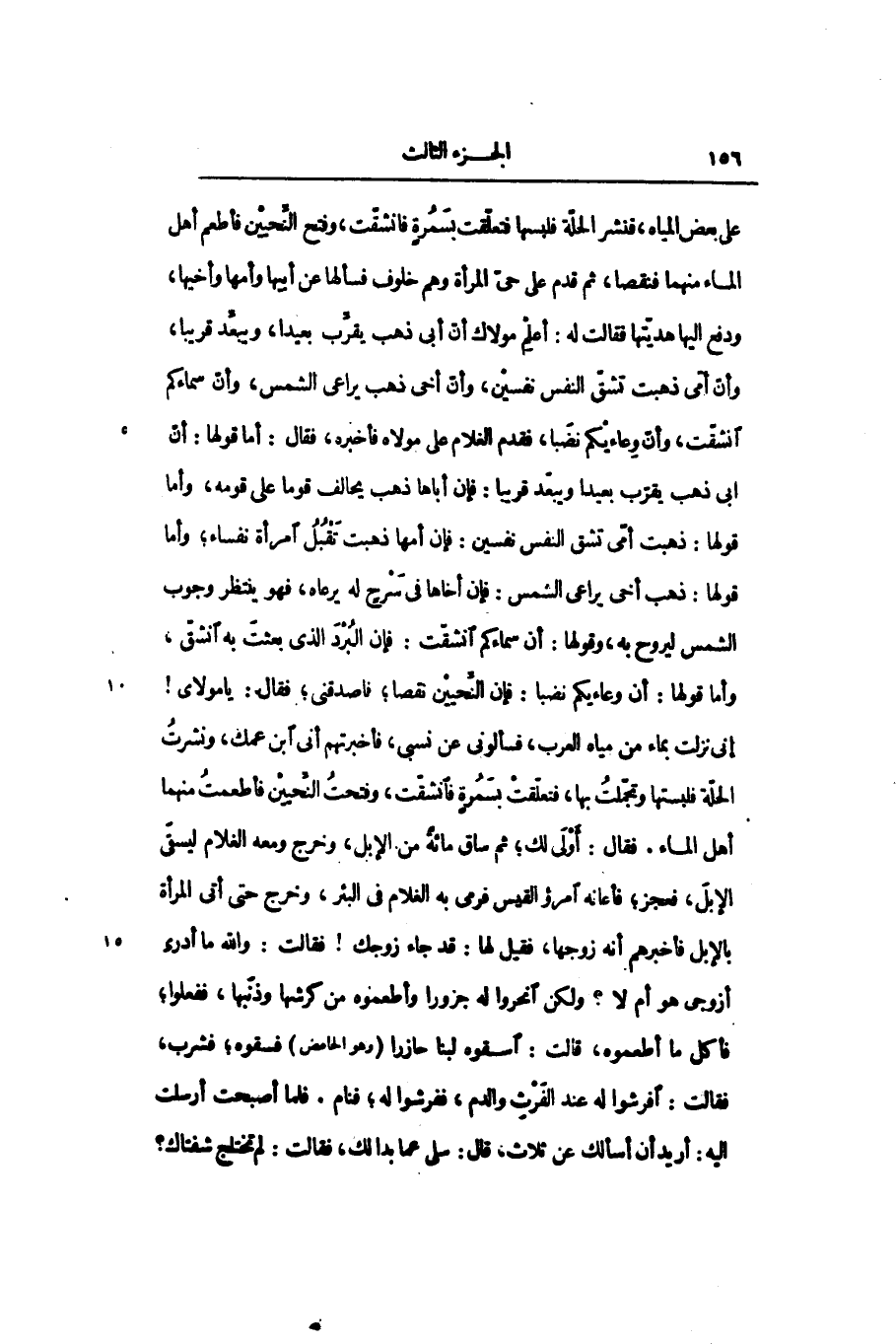 على بعض المياه، فنشر الحلّة فلبسها فتعلّقت بسمرة فانشقّت، وفتح النّحيين فأطعم أهل الماء منهما فنقصا، ثم قدم على حىّ المرأة وهم خلوف فسألها عن أبيها وأمها وأخيها، ودفع اليها هديّتها فقالت له: أعلم مولاك أنّ أبى ذهب يقرّب بعيدا، ويبعّد قريبا، وأنّ أمّى ذهبت تشقّ النفس نفسين، وأنّ أخى ذهب يراعى الشمس، وأنّ سماءكم انشقّت، وأنّ وعاءيكم نضبا، فقدم الغلام على مولاه فأخبره، فقال: أما قولها: أنّ ابى ذهب يقرّب بعيدا ويبعّد قريبا: فإن أباها ذهب يحالف قوما على قومه، وأما قولها: ذهبت أمّى تشق النفس نفسين: فإن أمها ذهبت تقبل امرأة نفساء؛ وأما قولها: ذهب أخى يراعى الشمس: فإن أخاها في سرح له يرعاه، فهو ينتظر وجوب الشمس ليروح به، وقولها: أن سماءكم انشقّت: فإن البرد الذى بعثت به انشقّ، وأما قولها: أن وعاءيكم نضبا: فإن النّحيين نقصا؛ فاصدقنى؛ فقال: يا مولاى! إنى نزلت بماء من مياه العرب، فسألونى عن نسبى، فأخبرتهم أنى ابن عمك، ونشرت الحلّة فلبستها وتجمّلت بها، فتعلّقت بسمرة فانشقّت، وفتحت النّحيين فأطعمت منهما أهل الماء. فقال: أولى لك؛ ثم ساق مائة من الإبل، وخرج ومعه الغلام ليسقى الإبل، فعجز؛ فأعانه امرؤ القيس فرمى به الغلام في البئر، وخرج حتى أتى المرأة بالإبل فأخبرهم أنه زوجها، فقيل لها: قد جاء زوجك! فقالت: والله ما أدرى أزوجى هو أم لا؟ ولكن انحروا له جزورا وأطعموه من كرشها وذنبها، ففعلوا؛ فأكل ما أطعموه، قالت: اسقوه لبنا حازرا (وهو الحامض) فسقوه؛ فشرب، فقالت: افرشوا له عند الفرث والدم، ففرشوا له؛ فنام. فلما أصبحت أرسلت اليه: أريد أن أسألك عن ثلاث، قال: سلى عما بدا لك، فقالت: لم تختلج شفتاك؟