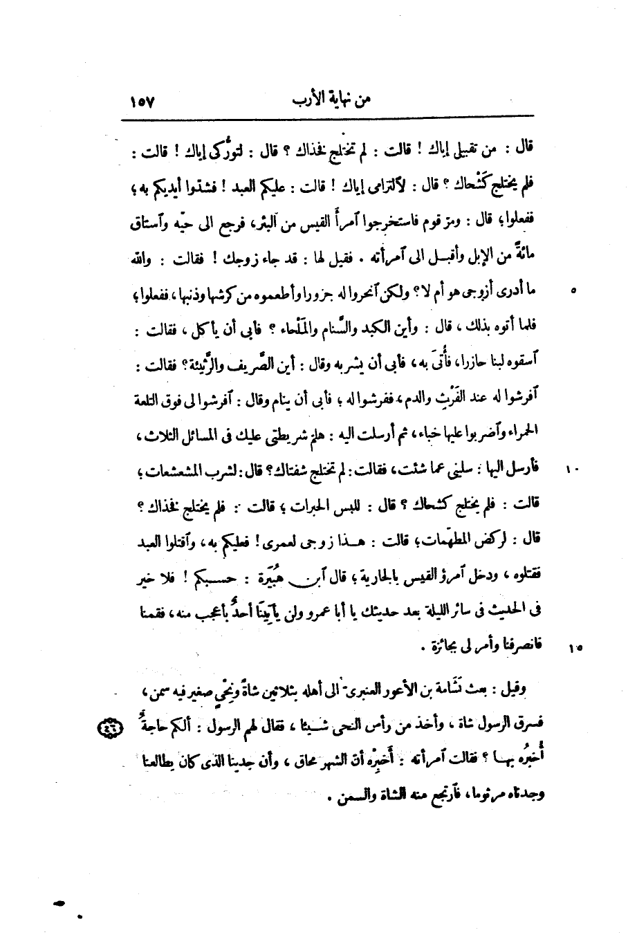فلم يختلج كشحاك؟ قال: لالتزامى إياك! قالت: عليكم العبد! فشدّوا أيديكم به؛ ففعلوا؛ قال: ومرّقوم فاستخرجوا امرأ القيس من البئر، فرجع الى حيّه واستاق مائة من الإبل وأقبل الى امرأته. فقيل لها: قد جاء زوجك! فقالت: والله ما أدرى أزوجى هو أم لا؟ ولكن انحروا له جزورا وأطعموه من كرشها وذنبها، ففعلوا؛ فلما أتوه بذلك، قال: وأين الكبد والسّنام والملحاء؟ فأبى أن يأكل، فقالت: