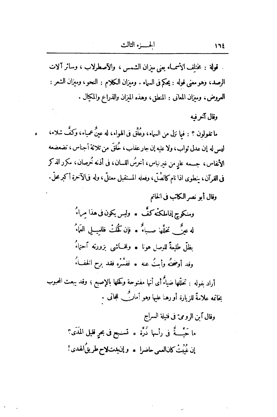 قولة: مختلف الأسماء يعنى ميزان الشمس، والآصطرلاب، وسائر آلات الرصد، وهو معنى قوله: يحكم في السماء. وميزان الكلام: النحو، وميزان الشعر: