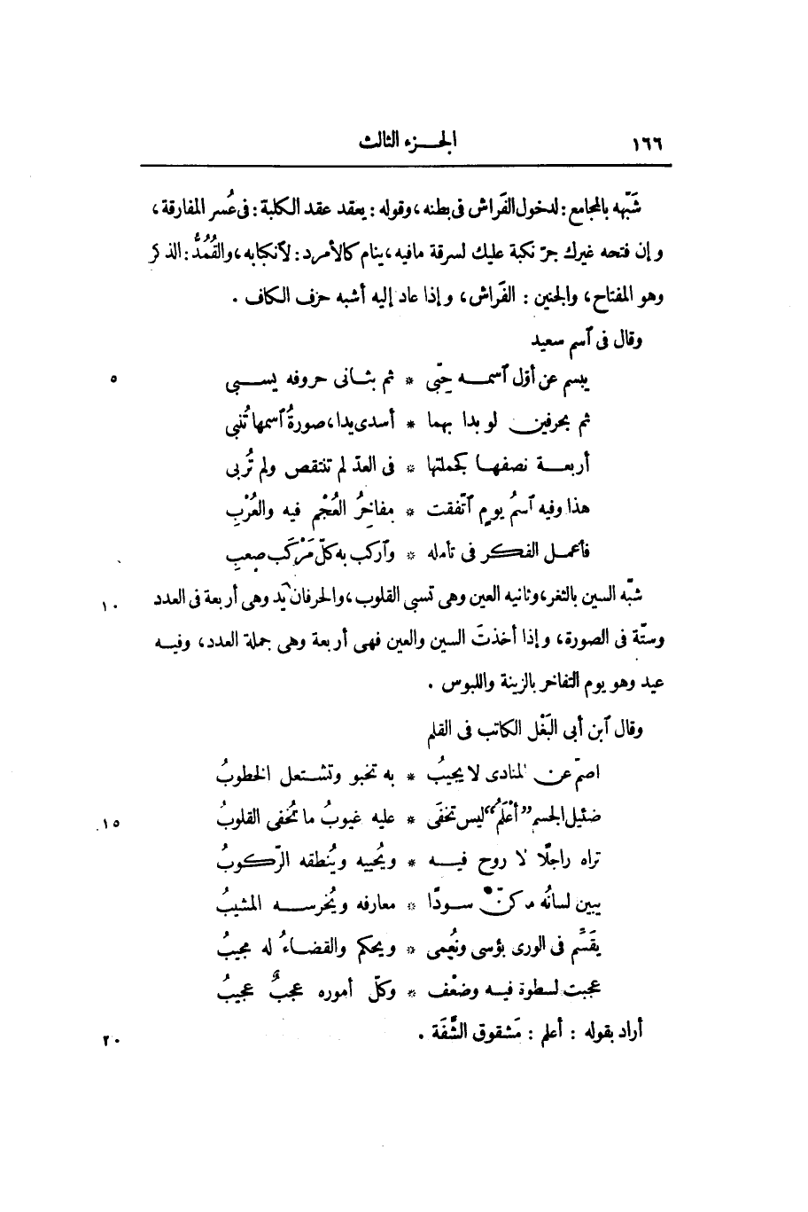 شبّهه بالمجامع: لدخول الفراش في بطنه، وقوله: يعقد عقد الكلبة: فى عسر المفارقة، وإن فتحه غيرك جرّ نكبة عليك لسرقة ما فيه، ينام كالأمرد: لانكبابه، والقمدّ: الذكر وهو المفتاح، والجنين: الفراش، وإذا عاد إليه أشبه حرف الكاف.