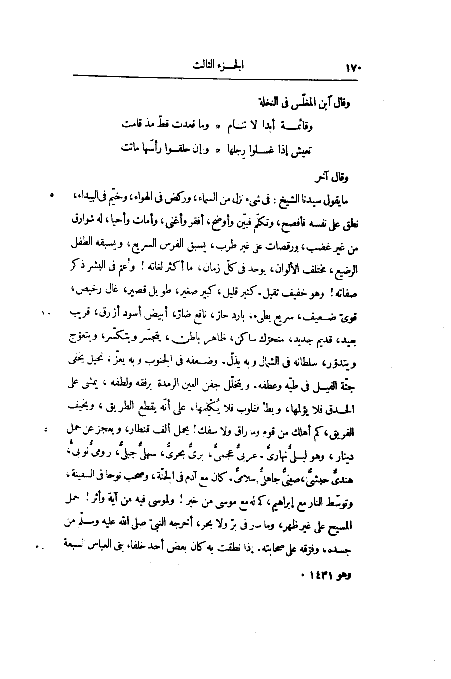 وقال آخر ما يقول سيدنا الشيخ: فى شىء نزل من السماء، وركض في الهواء، وخيّم في البيداء، نطق على نفسه فأفصح، وتكلّم فبيّن وأوضح، أفقر وأغنى، وأمات وأحيا، له شوارق من غير غضب، ورقصات على غير طرب، يسبق الفرس السريع، ويسبقه الطفل الرضيع، مختلف الألوان، يوجد في كلّ زمان، ما أكثر لغاته! وأعمّ في البشر ذكر صفاته! وهو خفيف ثقيل، كثير قليل، كبير صغير، طويل قصير، غال رخيص، قوىّ ضعيف، سريع بطىء، بارد حارّ، نافع ضارّ، أبيض أسود أزرق، قريب بعيد، قديم جديد، متحرّك ساكن، ظاهر باطن، يتجسّر ويتكسّر، ويتعوّج ويتدوّر، سلطانه في الشمال وبه يذلّ، وضعفه في الجنوب وبه يعزّ، نحيل يخفى جثّة الفيل في طيّه وعطفه. ويتخلّل جفن العين الرمدة برفقه ولطفه، يمشى على الحدق فلا يؤلمها، ويطأ القلوب فلا يكلمها، على أنّه يقطع الطريق، ويخيف الفريق، كم أهلك من قوم وما راق ولا سفك! يحمل ألف قنطار، ويعجز عن حمل دينار، وهو ليلىّ نهارىّ، عربىّ عجمىّ، برىّ بحرىّ، سهلىّ جبلىّ، رومىّ نوبىّ، هندىّ حبشىّ، صينىّ جاهلىّ إسلامىّ. كان مع آدم في الجنّة، وصحب نوحا في السفينة، وتوسّط النار مع إبراهيم، كم له مع موسى من خبر! ولموسى فيه من آية وأثر! حمل المسيح على غير ظهر، وما سر في برّ ولا بحر، أخرجه النبىّ صلّى الله عليه وسلّم من جسده، وفرّقه على صحابته، إذا نطقت به كان بعض أحد خلفاء بنى العباس السبعة وهو 1431.