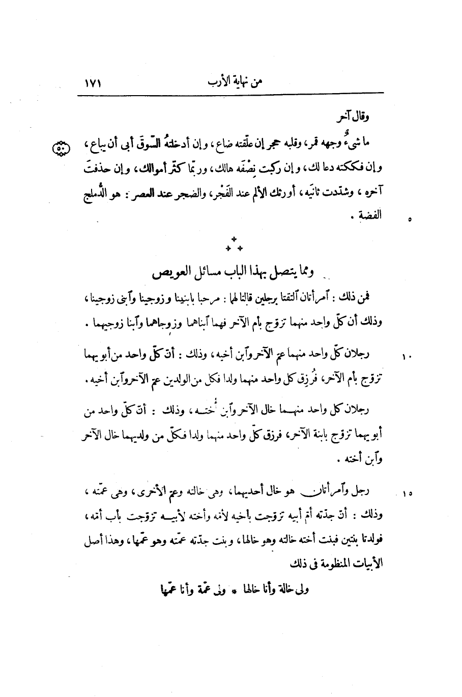 رجل وامرأتان هو خال أحديهما، وهى خالته وعمّ الأخرى، وهى عمّته، وذلك: أنّ جدّته أمّ أبيه تزوّجت بأخيه لأمّه وأخته لأبيه تزوّجت بأب أمّه، فولدتا بنتين فبنت أخته خالته وهو خالها، وبنت جدّته عمّته وهو عمّها، وهذا أصل الأبيات المنظومة في ذلك