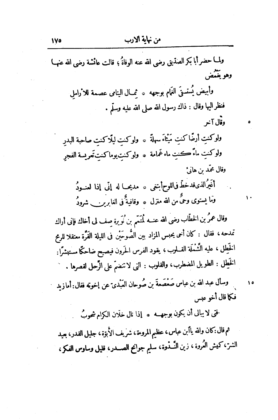 وقال عمر بن الخطّاب رضى الله عنه لمتمّم بن نويرة صف لى أخاك فإنى أراك تمدحه، فقال: كان أخى يحبس المزاد بين الصّوحين في الليلة القرّة معتقلا للرمح الخطل، عليه الشّملة القلوب، يقود الفرس الحرون فيصيح ضاحكا مستبشرا:
