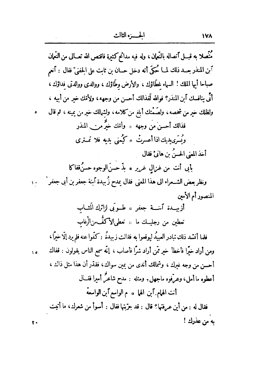 فلما أنشد ذلك تبادر العبيد ليوقعوا به فقالت زبيدة: كفّوا عنه فلم يرد إلّا خيرا، ومن أراد خيرا فأخطأ خير ممّن أراد شرا فأصاب، إنّه سمع الناس يقولون: قفاك أحسن من وجه غيرك، وشمالك أندى من يمين سواك، فقدّر أن هذا مثل ذاك، أعطوه ما أمل، وعرّفوه ما جهل؛ ومثله: مدح شاعر أميرا فقال