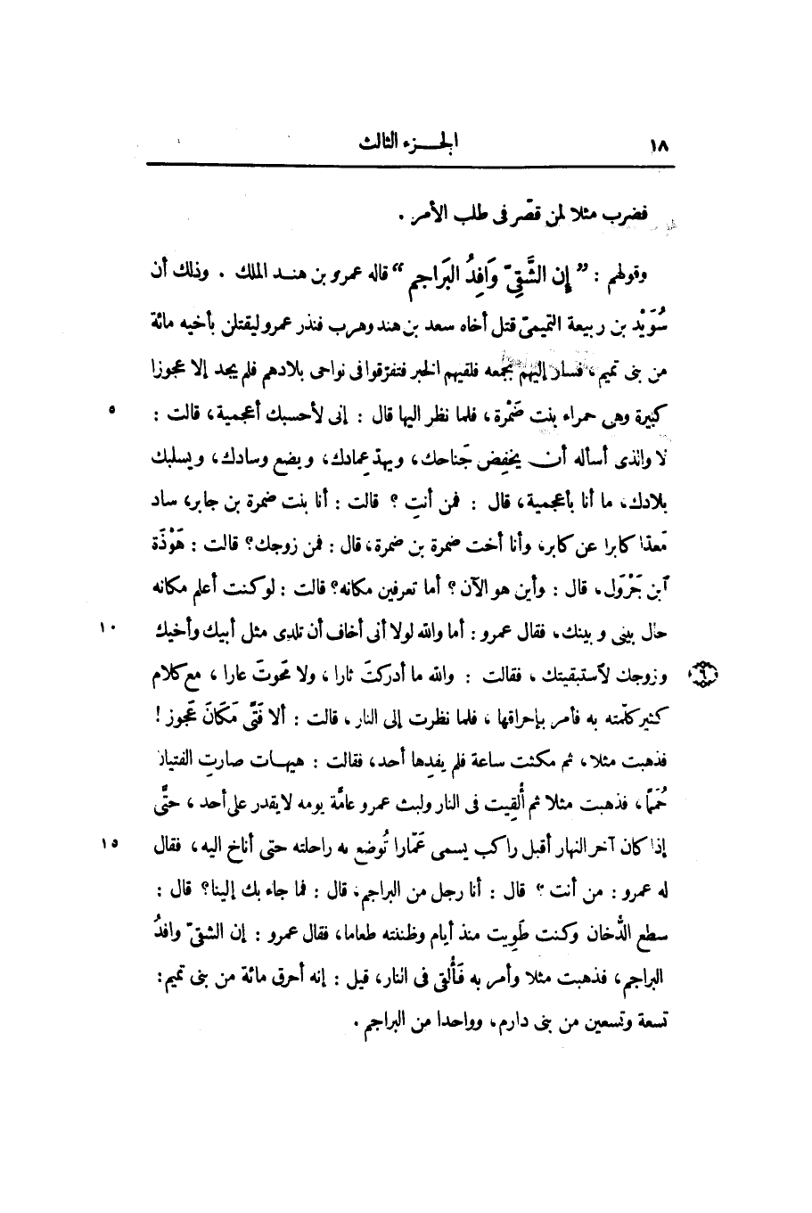 لا والذى أسأله أن يخفض جناحك، ويهدّ عمادك، ويضع وسادك، ويسلبك بلادك، ما أنا بأعجمية، قال: فمن أنت؟ قالت: أنا بنت ضمرة بن جابر، ساد معدّا كابرا عن كابر، وأنا أخت ضمرة بن ضمرة، قال: فمن زوجك؟ قالت: هوذة ابن جرول، قال: وأين هو الآن؟ أما تعرفين مكانه؟ قالت: لو كنت أعلم مكانه حال بينى وبينك، فقال عمرو: أما والله لولا أنى أخاف أن تلدى مثل أبيك وأخيك وزوجك لاستبقيتك، فقالت: والله ما أدركت ثارا، ولا محوت عارا، مع كلام كثير كلّمته به فأمر بإحراقها، فلما نظرت إلى النار، قالت: ألا فتى مكان عجوز! فذهبت مثلا، ثم مكثت ساعة فلم يفدها أحد، قالت: هيهات صارت الفتيان حمما، فذهبت مثلا ثم ألقيت في النار ولبث عمرو عامّة يومه لا يقدر على أحد، حتّى إذا كان آخر النهار أقبل راكب يسمى عمّارا توضع به راحلته حتى أناخ اليه، فقال له عمرو: من أنت؟ قال: أنا رجل من البراجم، قال: فما جاء بك إلينا؟ قال: