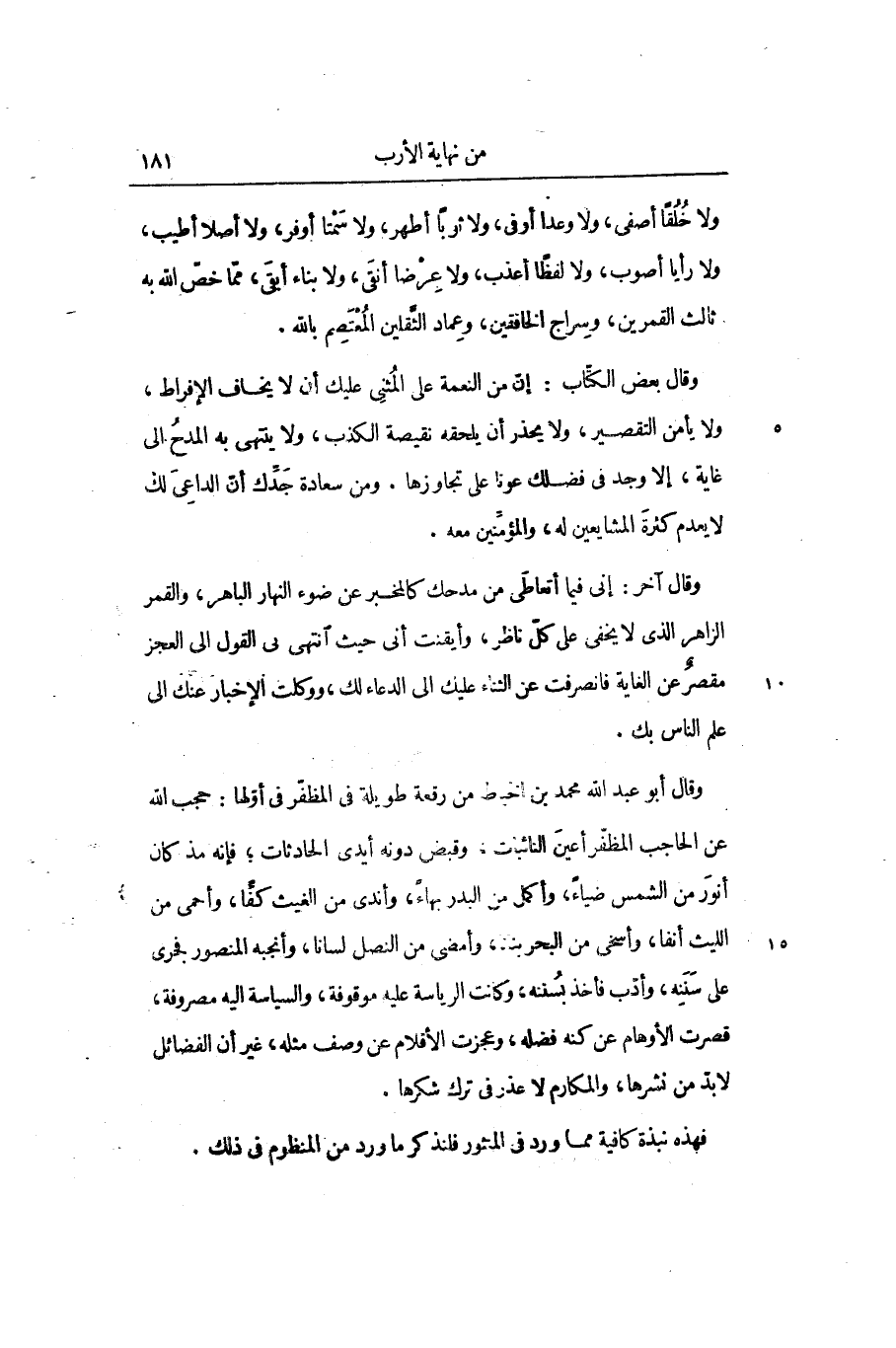 وقال بعض الكتّاب: إنّ من النعمة على المثنى عليك أن لا يخاف الإفراط، ولا يأمن التقصير، ولا يحذر أن يلحقه نقيصة الكذب، ولا ينتهى به المدح الى غاية، إلا وجد في فضلك عونا على تجاوزها. ومن سعادة جدّك أنّ الداعى لك لا يعدم كثرة المشايعين له، والمؤمنين معه.