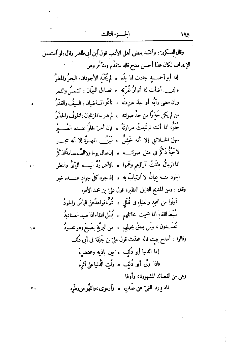 وقال العسكرىّ: وأنشد بعض أهل الأدب قول ابن أبى طاهر وقال: لو استعمل الإنصاف لكان هذا أحسن مدح قاله متقدّم ومتأخّر وهو