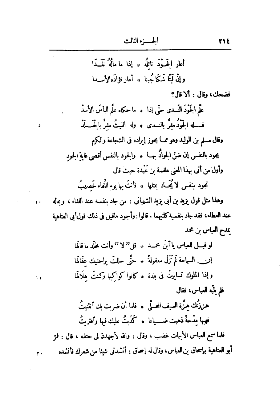 وهذا مثل قول يزيد بن أبى يزيد الشيبانى: من جاد بنفسه عند اللقاء، وبماله عند العطاء، فقد جاد بنفسيه كلتيهما. قالوا: وأجود ما قيل في ذلك قول أبى العتاهية يمدح العباس بن محمد