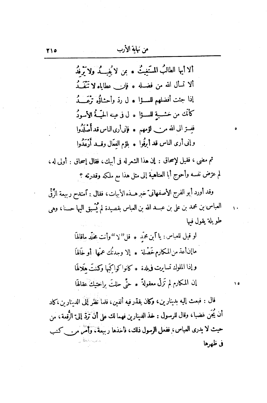 قال: فبعث إليه بدينارين، وكان يقدّر فيه ألفين، فلما نظر إلى الدينارين، كاد أن يجن غضبا، وقال للرسول: خذ الدينارين فهما لك على أن تردّ إلىّ الرّقعة، من حيث لا يدرى العباس؛ ففعل الرسول ذلك، فأخذها ربيعة، وأمر من كتب فى ظهرها