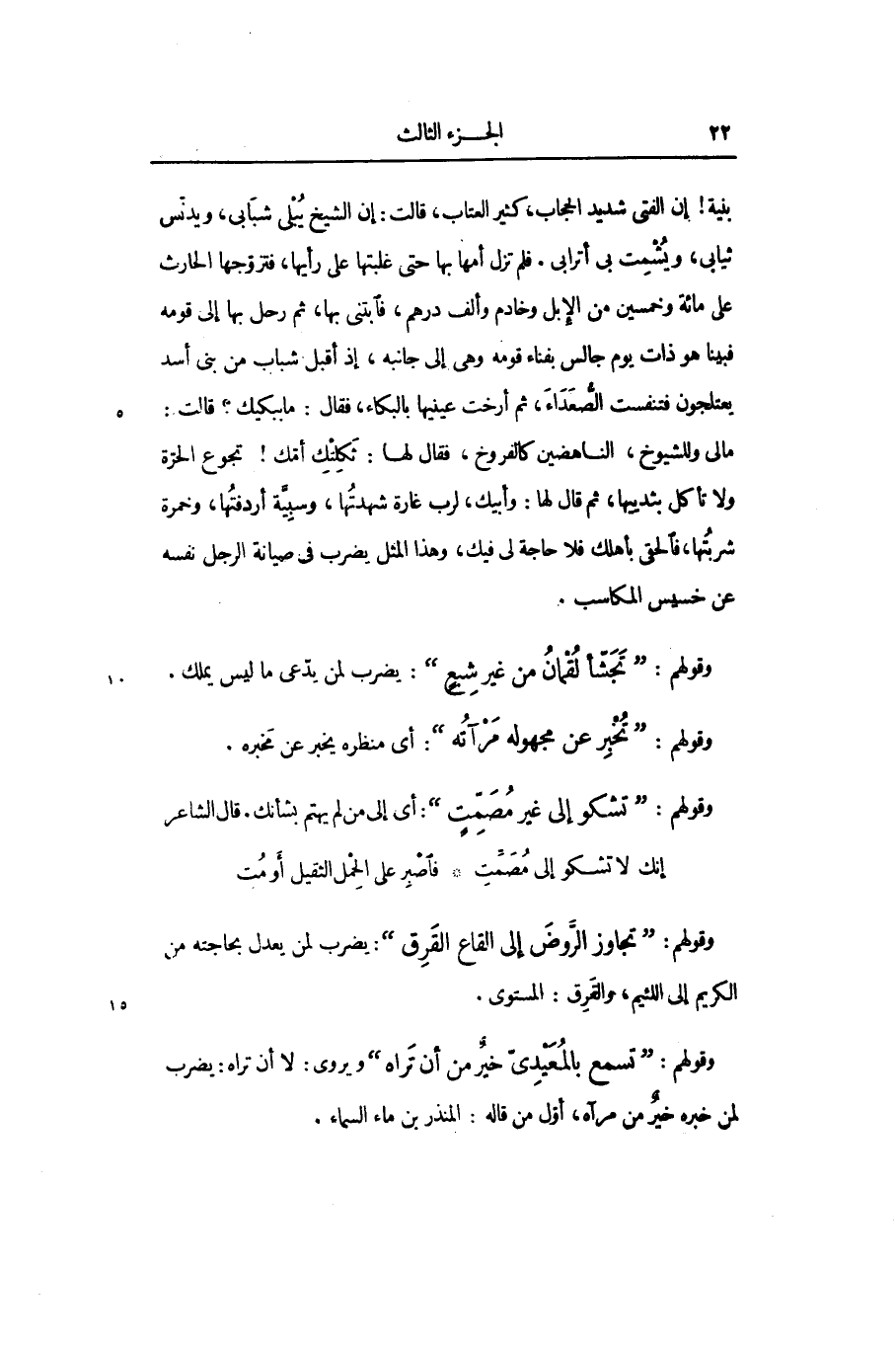 مالى وللشيوخ، الناهضين كالفروخ، فقال لها: ثكلتك أمّك! تجوع الحرّة ولا تأكل بثدييها، ثم قال لها: وأبيك، لرب غارة شهدتها، وسبيّة أردفتها، وخمرة شربتها، فالحقى بأهلك فلا حاجة لى فيك، وهذا المثل يضرب في صيانة الرجل نفسه عن خسيس المكاسب.