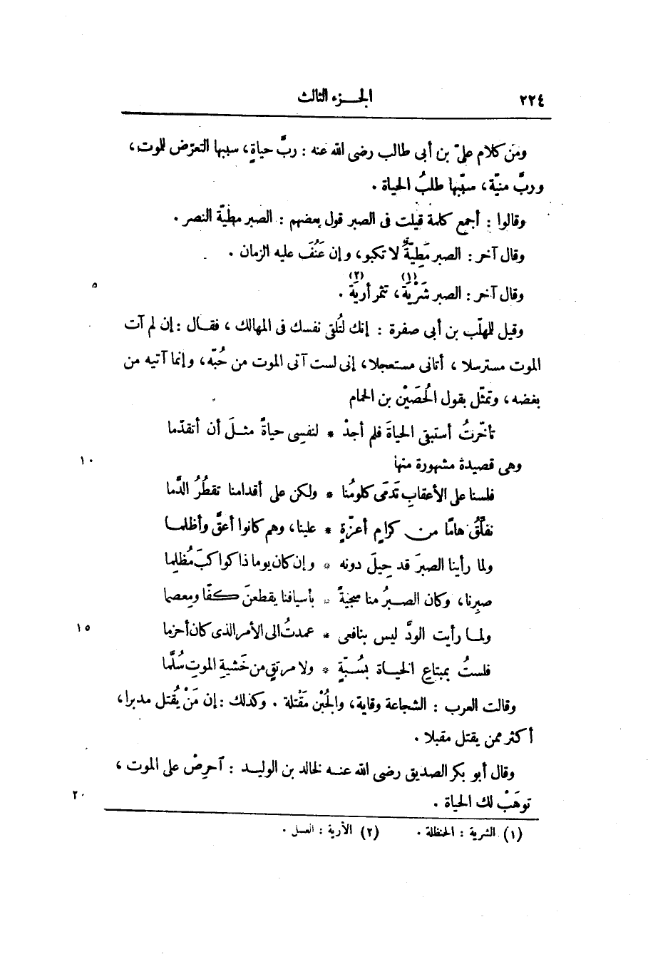 ومن كلام علىّ بن أبى طالب رضى الله عنه: ربّ حياة، سببها التعرّض للموت، وربّ منيّة، سبّبها طلب الحياة.