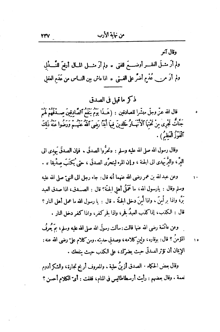 وقال بعض الحكماء: الصدق أزين حلية، والمعروف أربح تجارة، والشكر أدوم نعمة. وقال بعضهم: رأيت أرسطا طاليس في المنام، فقلت: أىّ الكلام أحسن؟