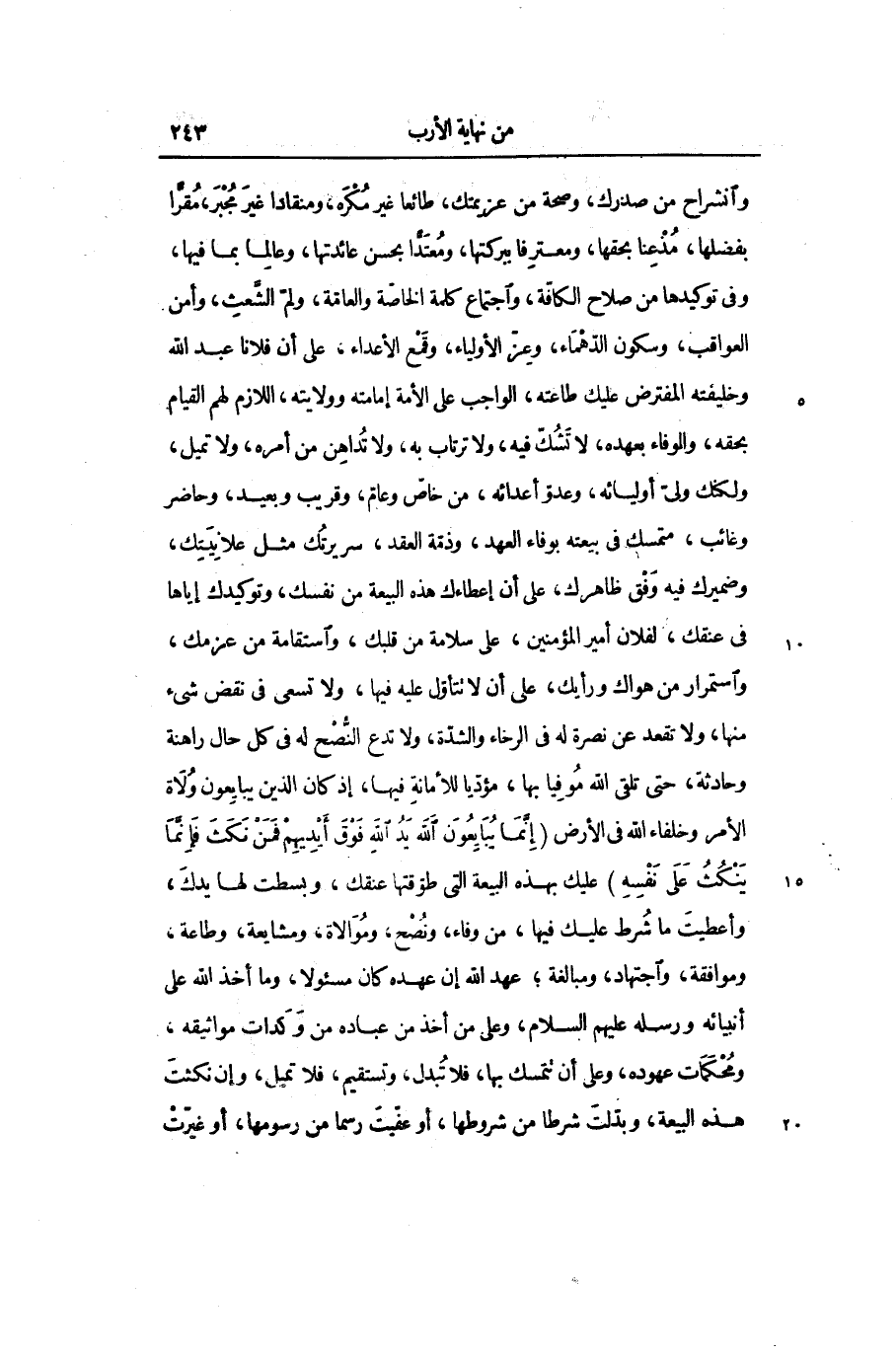 وانشراح من صدرك، وصحة من عزيمتك، طائعا غير مكره، ومنقادا غير مجبر، مقرّا بفضلها، مذعنا بحقها، ومعترفا ببركتها، ومعتدّا بحسن عائدتها، وعالما بما فيها، وفي توكيدها من صلاح الكافّة، واجتماع كلمة الخاصّة والعامّة، ولمّ الشّعث، وأمن العواقب، وسكون الدّهماء، وعزّ الأولياء، وقمع الأعداء، على أن فلانا عبد الله وخليفته المفترض عليك طاعته، الواجب على الأمة إمامته وولايته، اللازم لهم القيام بحقه، والوفاء بعهده، لا تشكّ فيه، ولا ترتاب به، ولا تداهن من أمره، ولا تميل، ولكنك ولىّ أوليائه، وعدوّ أعدائه، من خاصّ وعامّ، وقريب وبعيد، وحاضر وغائب، متمسك في بيعته بوفاء العهد، وذمّة العقد، سريرتك مثل علانيتك، وضميرك فيه وفق ظاهرك، على أن إعطاءك هذه البيعة من نفسك، وتوكيدك إياها فى عنقك، لفلان أمير المؤمنين، على سلامة من قلبك، واستقامة من عزمك، واستمرار من هواك ورأيك، على أن لا تتأوّل عليه فيها، ولا تسعى في نقض شىء منها، ولا تقعد عن نصرة له في الرخاء والشدّة، ولا تدع النّصح له في كل حال راهنة وحادثة، حتى تلقى الله موفيا بها، مؤدّيا للأمانة فيها، إذ كان الذين يبايعون ولاة الأمر وخلفاء الله في الأرض (إِنَّما يُبايِعُونَ اللَّهَ يَدُ اللَّهِ فَوْقَ أَيْدِيهِمْ فَمَنْ نَكَثَ فَإِنَّما يَنْكُثُ عَلى نَفْسِهِ)