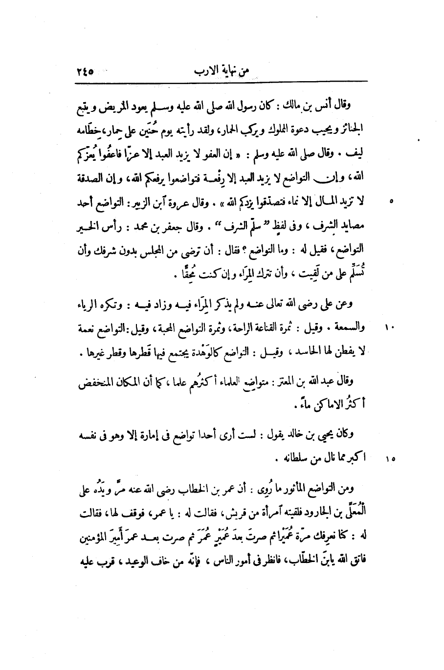 وقال أنس بن مالك: كان رسول الله صلّى الله عليه وسلّم يعود المريض ويتبع الجنائز ويجيب دعوة المملوك ويركب الحمار، ولقد رأيته يوم حنين على حمار، خطامه ليف. وقال صلّى الله عليه وسلم: «إن العفو لا يزيد العبد إلا عزّا فاعفوا يعزّكم الله، وإن التواضع لا يزيد العبد إلا رفعة فتواضعوا يرفعكم الله، وإن الصدقة لا تزيد المال إلا نماء فتصدّقوا يزدكم الله» . وقال عروة ابن الزبير: التواضع أحد مصايد الشرف، وفي لفظ «سلّم الشرف» . وقال جعفر بن محمد: رأس الخير التواضع، فقيل له: وما التواضع؟ فقال: أن ترضى من المجلس بدون شرفك وأن تسلّم على من لقيت، وأن تترك المراء وإن كنت محقّا.