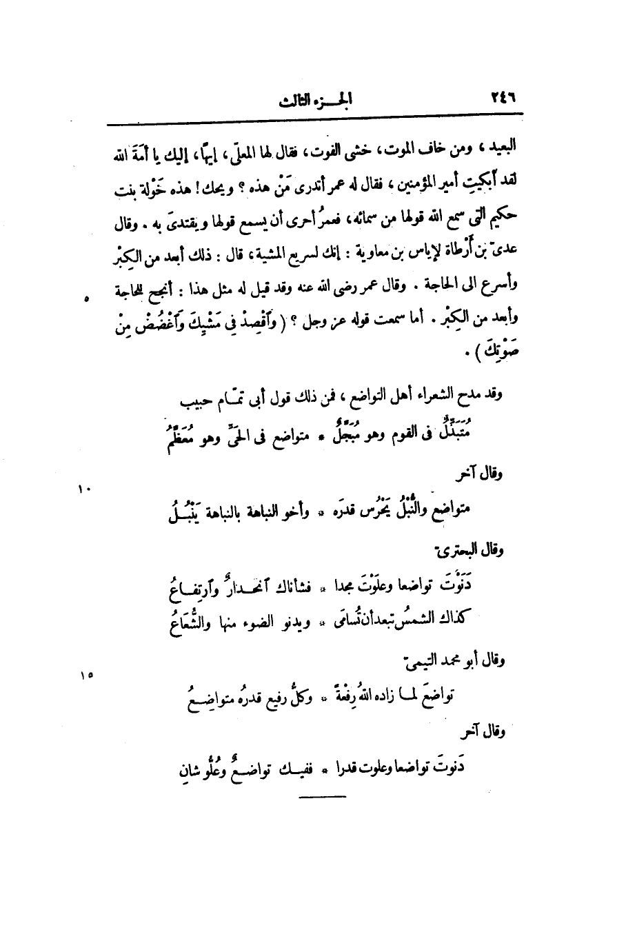 البعيد، ومن خاف الموت، خشى الفوت، فقال لها المعلّى، إيّها، إليك يا أمة الله لقد ابكيت أمير المؤمنين، فقال له عمر أتدرى من هذه؟ ويحك! هذه خولة بنت حكيم التى سمع الله قولها من سمائه، فعمر أحرى أن يسمع قولها ويقتدى به. وقال عدىّ بن أرطاة لإياس بن معاوية: إنك لسريع المشية، قال: ذلك أبعد من الكبر وأسرع الى الحاجة. وقال عمر رضى الله عنه وقد قيل له مثل هذا: أنجح للحاجة وأبعد من الكبر. أما سمعت قوله عزوجل؟ (وَاقْصِدْ فِي مَشْيِكَ وَاغْضُضْ مِنْ صَوْتِكَ) .