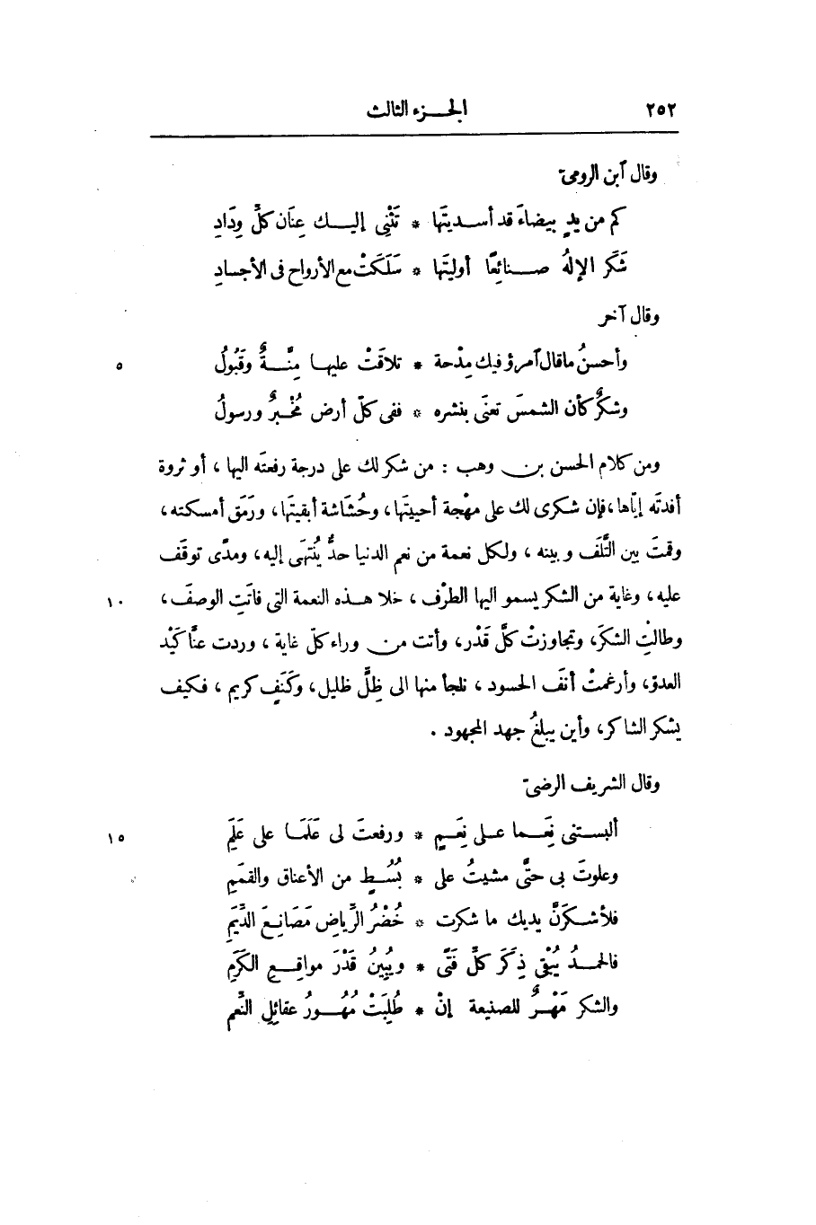 ومن كلام الحسن بن وهب: من شكر لك على درجة رفعته اليها، أو ثروة أفدته إيّاها، فإن شكرى لك على مهجة أحييتها، وحشاشة أبقيتها، ورمق أمسكته، وقمت بين التّلف وبينه، ولكل نعمة من نعم الدنيا حدّ ينتهى إليه، ومدى توقف عليه، وغاية من الشكر يسمو اليها الطرف، خلا هذه النعمة التى فاتت الوصف، وطالت الشكر، وتجاوزت كلّ قدر، وأتت من وراء كلّ غاية، وردت عنّا كيد العدوّ، وأرغمت أنف الحسود، نلجأ منها الى ظلّ ظليل، وكنف كريم، فكيف يشكر الشاكر، وأين يبلغ جهد المجهود.