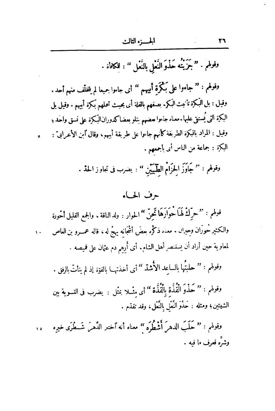 قولهم: «حرّك لها حوارها تحنّ» الحوار: ولد الناقة، والجمع القليل أحورة والكثير حوران وحيران، معناه ذكّره بعض أشجانه يهج له، قاله عمرو بن العاص لمعاوية حين أراد أن يستنصر أهل الشام، أى أرهم دم عثمان على قميصه.