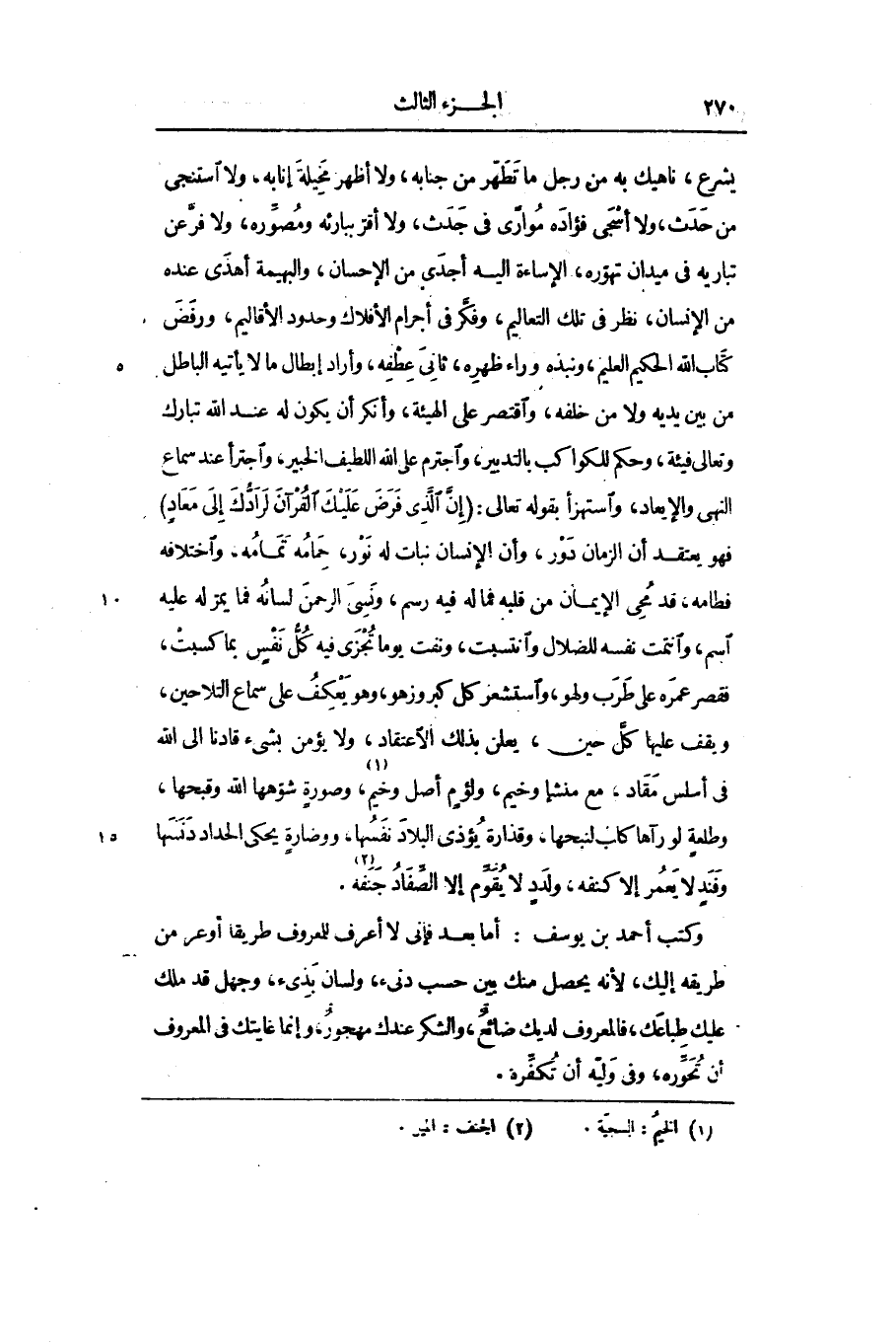 يشرع، ناهيك به من رجل ما تطهّر من جنابه، ولا أظهر مخيلة إنابه، ولا استنجى من حدث، ولا أسجى فؤاده موارى في جدث، ولا أقرّ ببارئه ومصوّره، ولافرّ عن تباريه في ميدان تهوّره، الإساءة اليه أجدى من الإحسان، والبهيمة أهدى عنده من الإنسان، نظر في تلك التعاليم، وفكّر في أجرام الأفلاك وحدود الأقاليم، ورفض كتاب الله الحكيم العليم، ونبذه وراء ظهره، ثانى عطفه، وأراد إبطال ما لا يأتيه الباطل من بين يديه ولا من خلفه، واقتصر على الهيئة، وأنكر أن يكون له عند الله تبارك وتعالى فيئة، وحكم للكواكب بالتدبير، واجترم على الله اللطيف الخبير، واجترأ عند سماع النهى والإيعاد، واستهزأ بقوله تعالى: (إِنَّ الَّذِي فَرَضَ عَلَيْكَ الْقُرْآنَ لَرادُّكَ إِلى مَعادٍ)