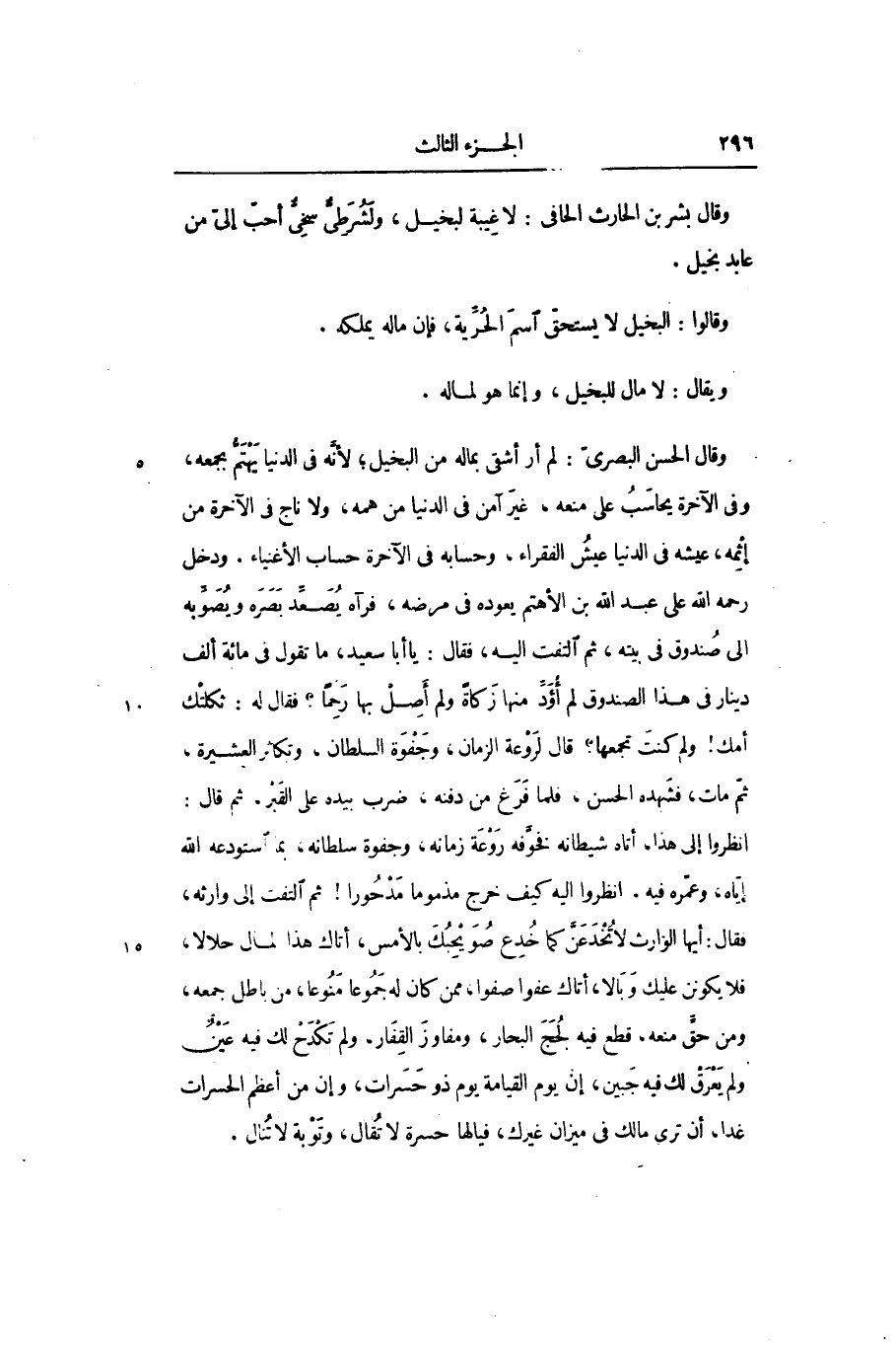 وقال الحسن البصرىّ: لم أر أشقى بماله من البخيل؛ لأنّه في الدنيا يهتمّ بجمعه، وفي الآخرة يحاسب على منعه، غير آمن في الدنيا من همه، ولا ناج في الآخرة من إثمه، عيشه في الدنيا عيش الفقراء، وحسابه في الآخرة حساب الأغنياء. ودخل رحمه الله على عبد الله بن الأهتم يعوده في مرضه، فرآه يصعّد بصره ويصوّبه الى صندوق في بيته، ثم التفت اليه، فقال: يا أبا سعيد، ما تقول في مائة ألف دينار في هذا الصندوق لم أودّ منها زكاة ولم أصل بها رحما؟ فقال له: ثكلتك أمك! ولم كنت تجمعها؟ قال لروعة الزمان، وجفوة السلطان، وتكاثر العشيرة، ثمّ مات، فشهده الحسن، فلما فرغ من دفنه، ضرب بيده على القبر، ثم قال: