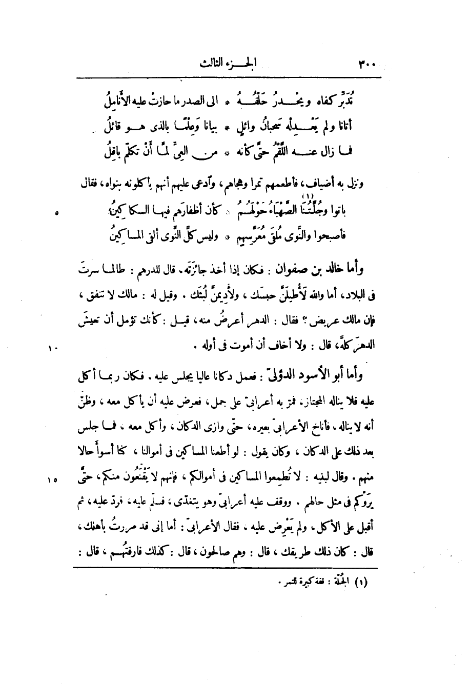 وأما أبو الأسود الدؤلىّ: فعمل دكانا عاليا يجلس عليه، فكان ربما أكل عليه فلا يناله المجتاز، فمرّ به أعرابىّ على جمل، فعرض عليه أن يأكل معه، وظنّ أنه لا يناله، فأناخ الأعرابىّ بعيره، حتّى وازى الدكان، وأكل معه، فما جلس بعد ذلك على الدكان، وكان يقول: لو أطعنا المساكين في أموالنا، كنا أسوأ حالا منهم. وقال لبنيه: لا تطمعوا المساكين في أموالكم، فإنهم لا يقنعون منكم، حتّى يروكم في مثل حالهم. ووقف عليه أعرابىّ وهو يتغدّى، فسلّم عليه، فردّ عليه، ثم أقبل على الأكل، ولم يعرض عليه، فقال الأعرابىّ: أما إنى قد مررت بأهلك، قال: كان ذلك طريقك، قال: وهم صالحون، قال: كذلك فارقتهم، قال: