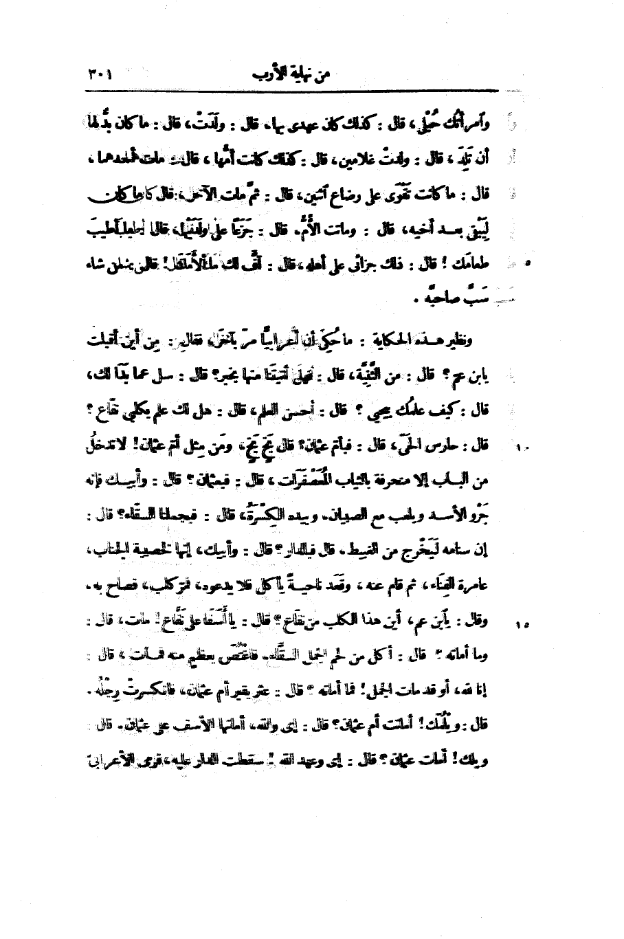 ونظير هذه الحكاية: ما حكى أن أعرابيّا مرّ بآخر، فقال: من أين أقبلت يابن عمّ؟ قال: من الثّنيّة، قال: فهل أتيتنا منها بخبر؟ قال: سل عما بدا لك، قال: كيف علمك بيحيى؟ قال: أحسن العلم، قال: هل لك علم بكلبى نفّاع؟
