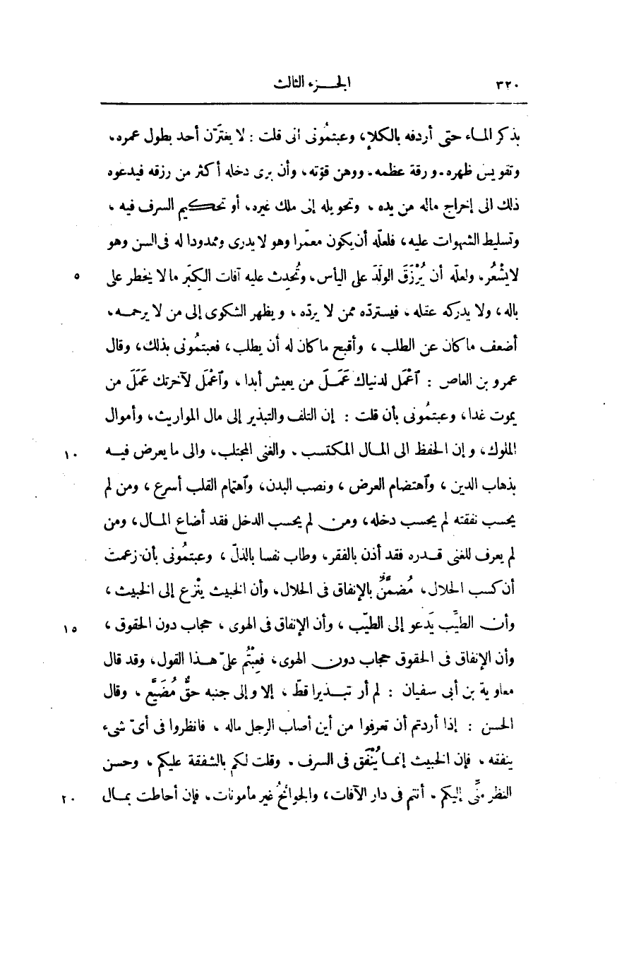 بذكر الماء حتى أردفه بالكلا، وعبتمونى انى قلت: لا يغترّن أحد بطول عمره، وتقويس ظهره، ورقة عظمه، ووهن قوّته، وأن برى دخله أكثر من رزقه فيدعوه ذلك الى إخراج ماله من يده، وتحويله إلى ملك غيره، أو تحكيم السرف فيه، وتسليط الشهوات عليه، فلعلّه أن يكون معمّرا وهو لا يدرى وممدودا له في السن وهو لا يشعر، ولعلّه أن يرزق الولد على اليأس، وتحدث عليه آفات الكبر ما لا يخطر على باله، ولا يدركه عقله، فيستردّه ممن لا يردّه، ويظهر الشكوى إلى من لا يرحمه، أضعف ما كان عن الطلب، وأقبح ما كان له أن يطلب، فعبتمونى بذلك، وقال عمرو بن العاص: اعمل لدنياك عمل من يعيش أبدا، واعمل لآخرتك عمل من يموت غدا، وعبتمونى بأن قلت: إن التلف والتبذير إلى مال المواريث، وأموال الملوك، وإن الحفظ الى المال المكتسب، والغنى المجتلب، والى ما يعرض فيه بذهاب الدين، واهتضام العرض، ونصب البدن، واهتمام القلب أسرع، ومن لم يحسب نفقته لم يحسب دخله، ومن لم يحسب الدخل فقد أضاع المال، ومن لم يعرف للغنى قدره فقد أذن بالفقر، وطاب نفسا بالذلّ، وعبتمونى بأن زعمت أن كسب الحلال، مضمّن بالإنفاق في الحلال، وأن الخبيث ينزع إلى الخبيث، وأن الطيّب يدعو إلى الطيّب، وأن الإنفاق في الهوى، حجاب دون الحقوق، وأن الإنفاق في الحقوق حجاب دون الهوى، فعبتم علىّ هذا القول، وقد قال معاوية بن أبى سفيان: لم أر تبذيرا قطّ، إلا وإلى جنبه حقّ مضيّع، وقال الحسن: إذا أردتم أن تعرفوا من أين أصاب الرجل ماله، فانظروا في أىّ شىء ينفقه، فإن الخبيث إنما ينفق في السرف، وقلت لكم بالشفقة عليكم، وحسن النظر منّى إليكم، أنتم في دار الآفات، والجوائح غير مأمونات، فإن أحاطت بمال