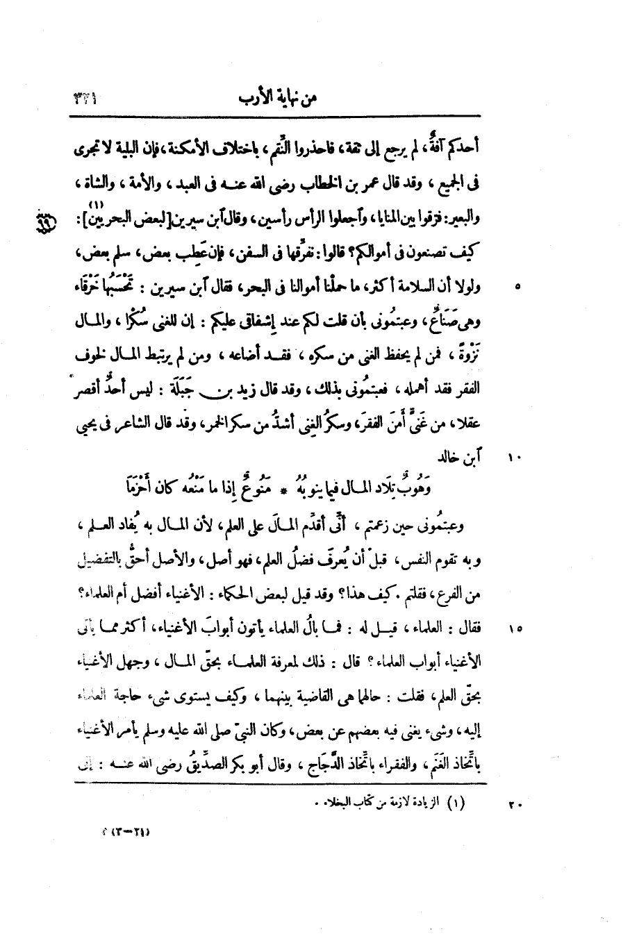 فقال: العلماء، قيل له: فما بال العلماء يأتون أبواب الأغنياء، أكثر مما يأتى الأغنياء أبواب العلماء؟ قال: ذلك لمعرفة العلماء بحقّ المال، وجهل الأغنياء بحقّ العلم، فقلت: حالهما هى القاضية بينهما، وكيف يستوى شىء حاجة العلماء إليه، وشىء يغنى فيه بعضهم عن بعض، وكان النبىّ صلّى الله عليه وسلم يأمر الأغنياء باتّخاذ الغنم، والفقراء باتّخاذ الدّجاج، وقال أبو بكر الصدّيق رضى الله عنه: إنى