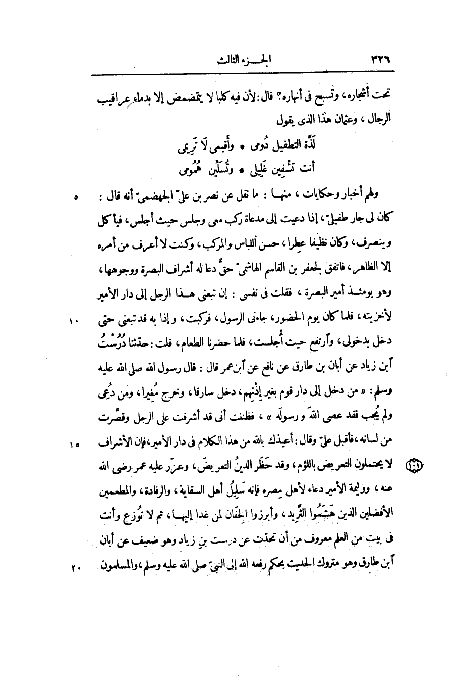 كان لى جار طفيلىّ، إذا دعيت إلى مدعاة ركب معى وجلس حيث أجلس، فيأكل وينصرف، وكان نظيفا عطرا، حسن اللباس والمركب، وكنت لا أعرف من أمره إلا الظاهر، فاتفق لجعفر بن القاسم الهاشمىّ حقّ دعا له أشراف البصرة ووجوهها، وهو يومئذ أمير البصرة، فقلت في نفسى: إن تبعنى هذا الرجل إلى دار الأمير لأخزيته، فلما كان يوم الحضور، جاءنى الرسول، فركبت، وإذا به قد تبعنى حتى دخل بدخولى، وارتفع حيث أجلست، فلما حضرنا الطعام، قلت: حدّثنا درست ابن زياد عن أبان بن طارق عن نافع عن ابن عمر قال: قال رسول الله صلّى الله عليه وسلم: «من دخل إلى دار قوم بغير إذنهم، دخل سارقا، وخرج مغيرا، ومن دعى ولم يجب فقد عصى الله ورسوله» ، فظننت أنى قد أشرفت على الرجل وقصّرت من لسانه، فأقبل علىّ وقال: أعيذك بالله من هذا الكلام في دار الأمير، فإن الأشراف لا يحتملون التعريض باللؤم، وقد حظر الدين التعريض، وعزّر عليه عمر رضى الله عنه، ووليمة الأمير دعاء لأهل مصره فإنه سليل أهل السقاية، والرفادة، والمطعمين الأفضلين الذين هشموا الثّريد، وأبرزوا الجفان لمن غدا إليها، ثم لا توزع وأنت فى بيت من العلم معروف من أن تحدّث عن درست بن زياد وهو ضعيف عن أبان ابن طارق وهو متروك الحديث بحكم رفعه الله إلى النبىّ صلّى الله عليه وسلم، والمسلمون