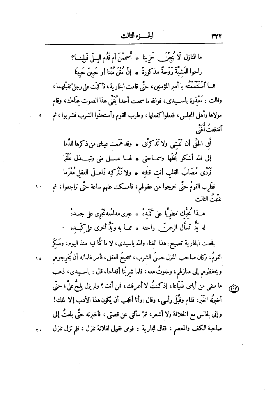 فجعلت الجارية تصيح: هذا الغناء والله يا سيدى، لا ما كنّا فيه منذ اليوم، وسكر القوم، وكان صاحب المنزل حسن الشرب، صحيح العقل، فأمر غلمانه أن يخرجوهم ويحفظوهم إلى منازلهم، وخلوت معه، فلما شربنا أقداحا، قال: يا سيدى، ذهب ما مضى من أيامى ضياعا، إذ كنت لا أعرفك، فمن أنت؟ ولم يزل يلحّ علىّ، حتّى أخبرته الخبر، فقام وقبّل رأسى، وقال: وأنا أعجب أن يكون هذا الأدب إلا لملك! وإنى لجالس مع الخلافة ولا أشعر، ثمّ سألنى عن قصتى، فأخبرته حتّى بلغت إلى صاحبة الكف والمعصم، فقال للجارية: قومى فقولى لفلانة تنزل، فلم تزل تنزل