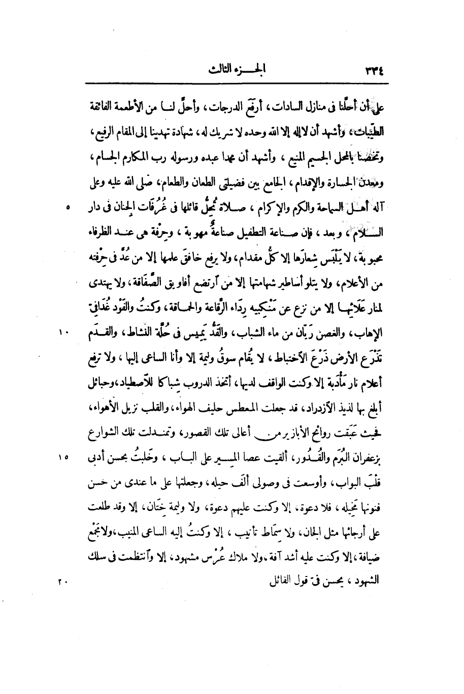 على أن أحلّنا في منازل السادات، أرفع الدرجات، وأحلّ لنا من الأطعمة الفائقة الطيّبات، وأشهد أن لا إله إلا الله وحده لا شريك له، شهادة تهدينا إلى المقام الرفيع، وتخصنا بالمحل الجسيم المنيع، وأشهد أن محمدا عبده ورسوله رب المكارم الجسام، ومعدن الجسارة والإقدام، الجامع بين فضيلتى الطعان والطعام، صلى الله عليه وعلى آله أهل السماحة والكرم والإكرام، صلاة تحلّ قائلها في غرفات الجنان في دار السلام، وبعد، فإن صناعة التطفيل صناعة مهوبة، وحرفة هى عند الظرفاء محبوبة، لا يلبس شعارها إلا كلّ مقدام، ولا يرفع خافق علمها إلا من عدّ في حرفته من الأعلام، ولا يتلو أساطير شهامتها إلا من ارتضع أفاويق الصّفاقة، ولا يهتدى لمنار علائها إلا من نزع عن منكبيه رداء الرّقاعة والحماقة، وكنت والفود غدافىّ الإهاب، والغصن ريّان من ماء الشباب، والقدّ يميس في حلّة النشاط، والقدم تذرع الأرض ذرع الاختباط، لا يقام سوق وليمة إلا وأنا الساعى إليها، ولا ترفع أعلام نار مأدبة إلا وكنت الواقف لديها، أتخذ الدروب شباكا للاصطياد، وحبائل أبلغ بها لذيذ الازدراد، قد جعلت المعطس حليف الهواء، والقلب نزيل الأهواء، فحيث عبقت روائح الأبازير من أعالى تلك القصور، وتمندلت تلك الشوارع بزعفران البرم والقدور، ألقيت عصا المسير على الباب، وخلبت بحسن أدبى قلب البواب، وأوسعت في وصولى ألف حيله، وجعلتها على ما عندى من حسن فنونها مخيله، فلا دعوة، إلا وكنت عليهم دعوة، ولا وليمة ختان، إلا وقد طلعت على أرجائها مثل الجان، ولا سماط تأنيب، إلا وكنت إليه الساعى المنيب، ولا مجمع ضيافة، إلا وكنت عليه أشد آفة، ولا ملاك عرس مشهود، إلا وانتظمت في سلك الشهود، يحسن فيّ قول القائل