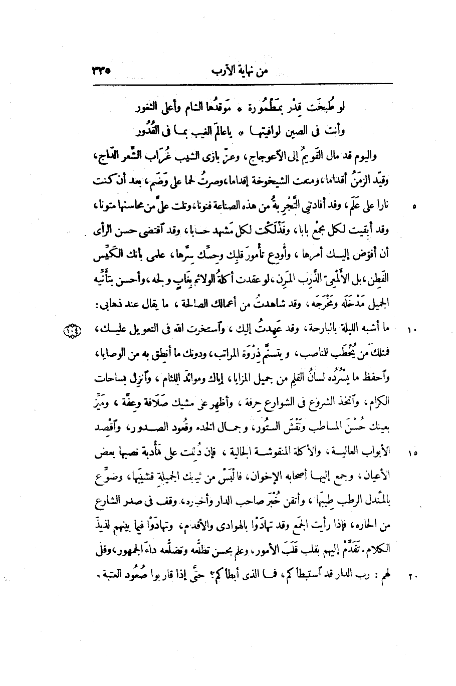 واليوم قد مال القويم إلى الاعوجاج، وعزّ بازى الشيب غراب الشّعر الدّاج، وقيّد الزمن أقداما، ومنعت الشيخوخة إقداما، وصرت لحما على وضم، بعد أن كنت نارا على علم، وقد أفادتنى التّجربة من هذه الصناعة فنونا، وتلت علىّ من محاسنها متونا، وقد أبقيت لكل مجمع بابا، وفذلكت لكل مشهد حسابا، وقد اقتضى حسن الرأى أن أفوّض إليك أمرها، وأودع تأمور قلبك وحسّك سرّها، علمى بأنك الكيّس الفطن، بل الألمعىّ الذّرب المرن، لو عقدت أكلة الولائم بغاب ولجه، وأحسن بتأنّيه الجميل مدخله ومخرجه، وقد شاهدت من أعمالك الصالحة، ما يقال عند ذهابى:
