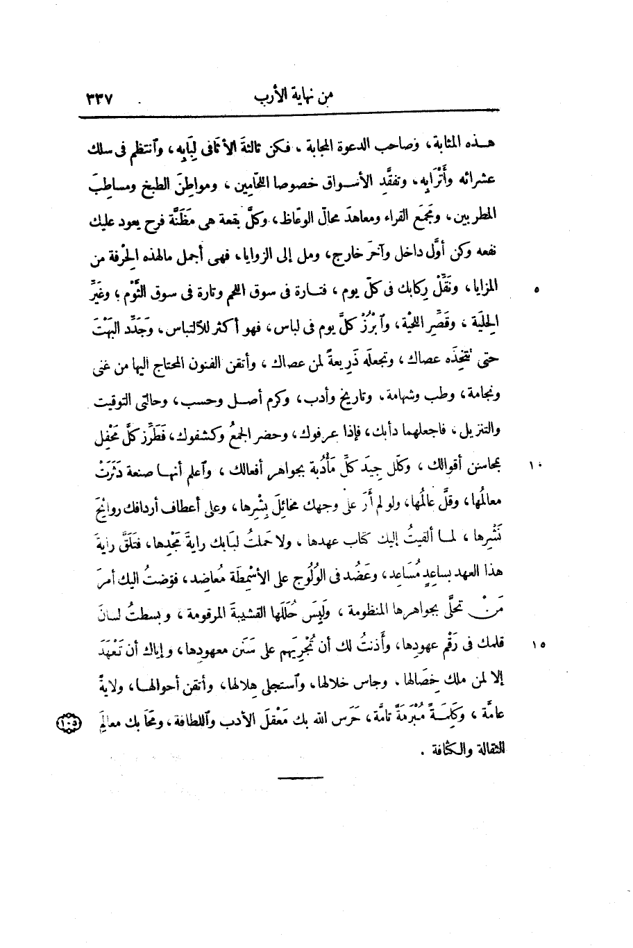 هذه المثابة، وصاحب الدعوة المجابة، فكن ثالثة الأثافى لبابه، وانتظم في سلك عشرائه وأترابه، وتفقّد الأسواق خصوصا اللّحامين، ومواطن الطبخ ومساطب المطربين، ومجمع القراء ومعاهد محالّ الوعّاظ، وكلّ بقعة هى مظنّة فرح يعود عليك نفعه وكن أوّل داخل وآخر خارج، ومل إلى الزوايا، فهى أجمل ما لهذه الحرفة من المزايا، ونقّل ركابك في كلّ يوم، فتارة في سوق اللحم وتارة في سوق الثّوم؛ وغيّر الحلية، وقصّر اللحية، وابرز كلّ يوم في لباس، فهو أكثر للالتباس، وجدّد البهت حتى تتخذه عصاك، وتجعله ذريعة لمن عصاك، وأتقن الفنون المحتاج اليها من غنى ونجامة، وطب وشهامة، وتاريخ وأدب، وكرم أصل وحسب، وحالتى التوقيت والتنزيل، فاجعلهما دأبك، فإذا عرفوك، وحضر الجمع وكشفوك، فطرّز كلّ محفل بمحاسنن أقوالك، وكلّل جيد كلّ مأدبة بجواهر أفعالك، واعلم أنها صنعة دثرت معالمها، وقلّ عالمها، ولو لم أر على وجهك مخائل بشرها، وعلى أعطاف أردافك روائح نشرها، لما ألقيت إليك كتاب عهدها، ولا حملت لبابك راية مجدها، فتلقّ راية هذا العهد بساعد مساعد، وعضد في الولوج على الأسمطة معاضد، فوّضت اليك أمر من تحلّى بجواهرها المنظومة، ولبس حللها القشيبة المرقومة، وبسطت لسان قلمك في رقم عهودها، وأذنت لك أن تجريهم على سنن معهودها، وإياك أن تعهد إلا لمن ملك خصالها، وجاس خلالها، واستجلى هلالها، وأتقن أحوالها، ولاية عامّة، وكلمة مبرمة تامّة، حرس الله بك معقل الأدب واللطافة، ومحابك معالم الثقالة والكثافة.