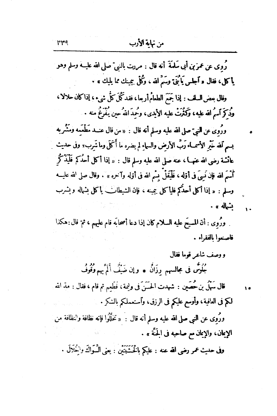 روى عن عمر بن أبى سلمة أنه قال: مررت بالنبىّ صلّى الله عليه وسلم وهو يأكل، فقال «اجلس يا بنىّ وسمّ الله، وكل بيمينك مما يليك» .