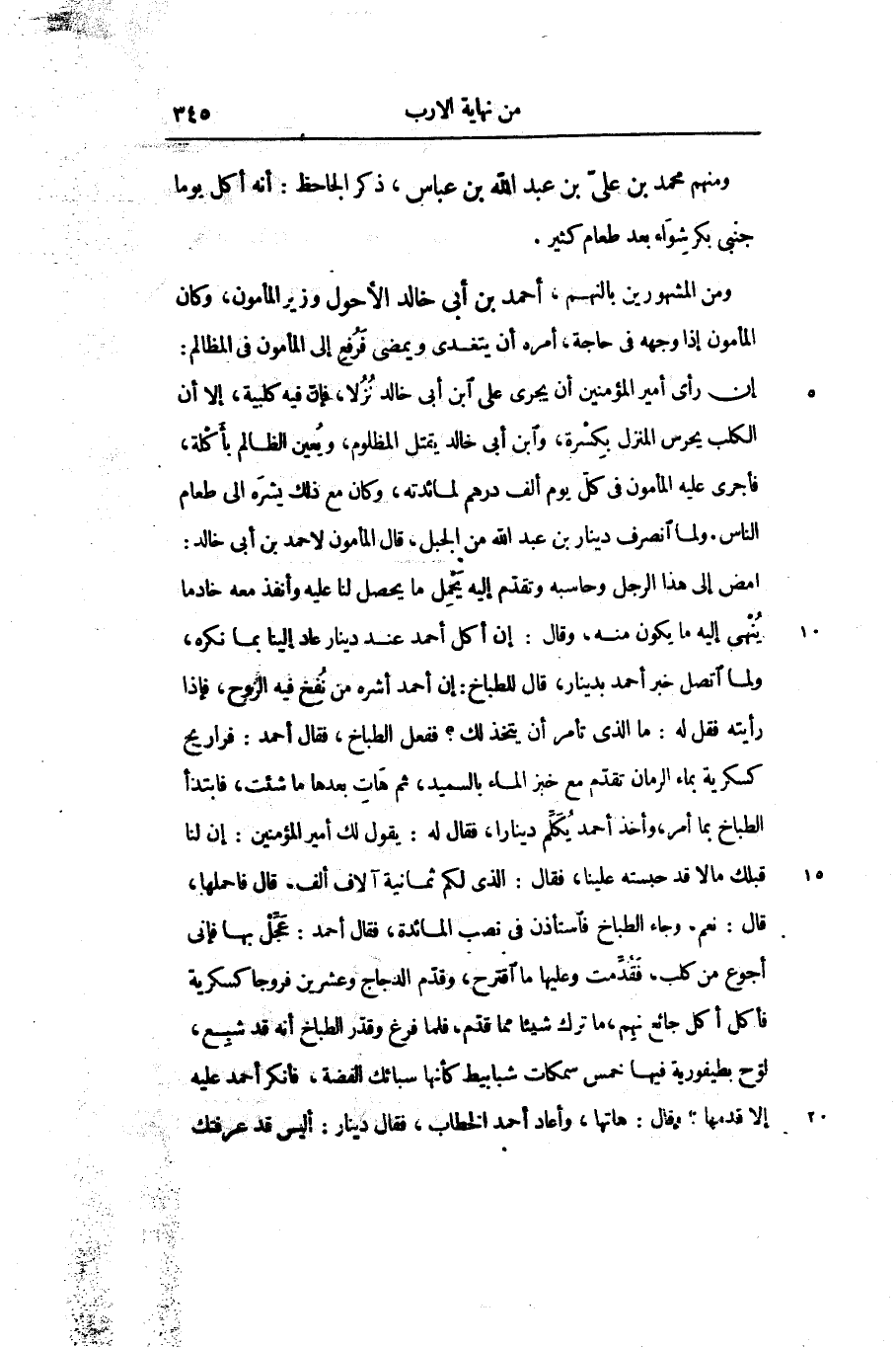 ومن المشهورين بالنهم، أحمد بن أبى خالد الأحول وزير المأمون، وكان المأمون إذا وجهه في حاجة، أمره أن يتغدى ويمضى فرفع إلى المأمون في المظالم: