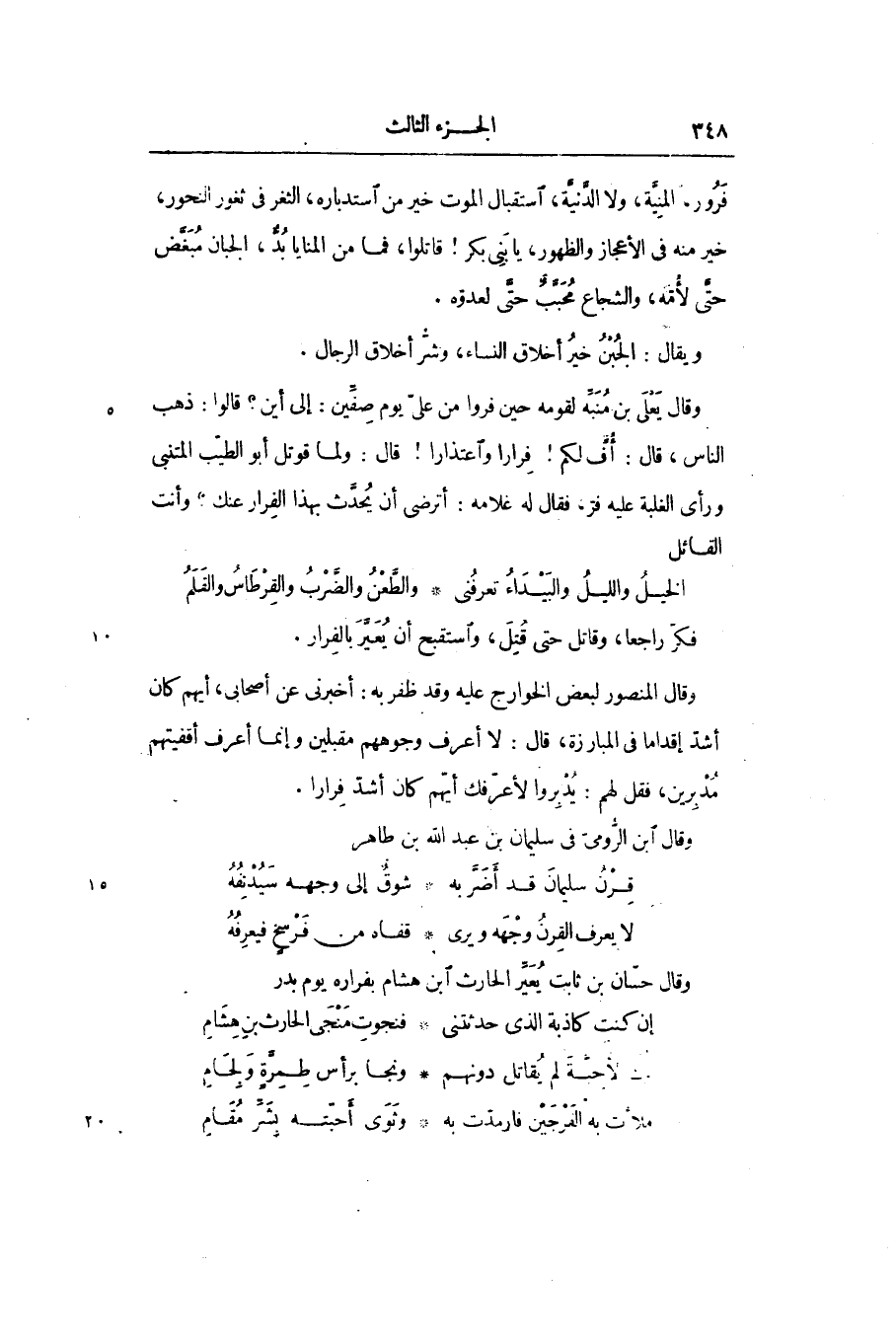 وقال يعلى بن منبّه لقومه حين فروا من علىّ يوم صفّين: إلى أين؟ قالوا: ذهب الناس، قال: أفّ لكم! فرارا واعتذارا! قال: ولما قوتل أبو الطيّب المتنبى ورأى الغلبة عليه فرّ، فقال له غلامه: أترضى أن يحدّث بهذا الفرار عنك؟ وأنت القائل