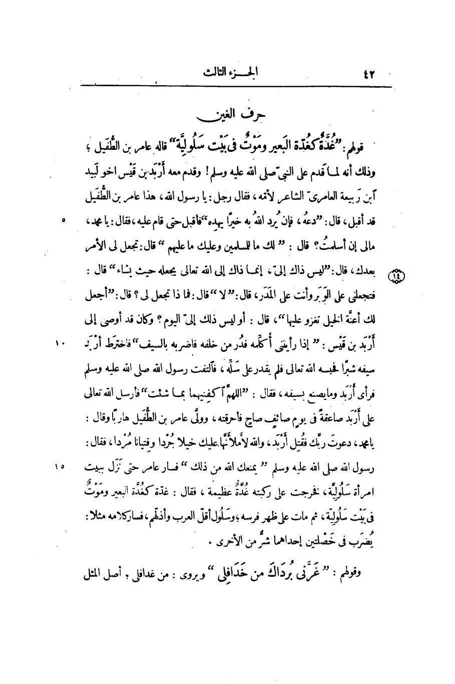 قولهم: «غدّة كغدّة البعير وموت في بيت سلوليّة» قاله عامر بن الطّفيل؛ وذلك أنه لما قدم على النبىّ صلّى الله عليه وسلم! وقدم معه أربد بن قيس اخو لبيد ابن ربيعة العامرىّ الشاعر لأمّه، فقال رجل: يا رسول الله، هذا عامر بن الطّفيل قد أقبل، قال: «دعه، فإن يرد الله به خيرا يهده» فأقبل حتى قام عليه، فقال: يا محمد، مالى إن أسلمت؟ قال: «لك ما للمسلمين وعليك ما عليهم» قال: تجعل لى الأمر بعدك، قال: «ليس ذاك إلىّ، إنما ذاك إلى الله تعالى يجعله حيث يشاء» قال: