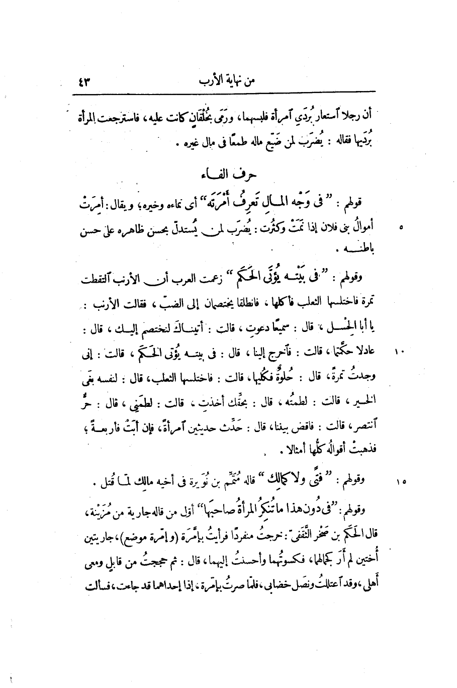 عادلا حكّمتما، قالت: فاخرج إلينا، قال: فى بيته يؤتى الحكم، قالت: إنى وجدت تمرة، قال: حلوة فكليها، قالت: فاختلسها الثعلب، قال: لنفسه بغى الخير، قالت: لطمته، قال: بحقّك أخذت، قالت: لطمنى، قال: حرّ انتصر، قالت: فاقض بيننا، قال: حدّث حديثين امرأة، فإن أبت فأربعة؛ فذهبت أقواله كلّها أمثالا.