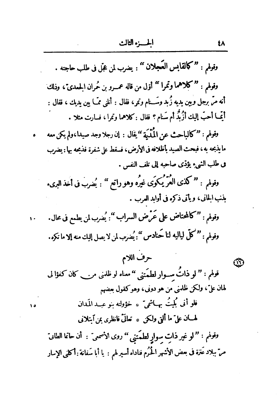 وقولهم: «كذى العرّ يكوى غيره وهو راتع» : يضرب في أخذ البرىء بذنب الجانى، ويأتى ذكره في أوابد العرب.