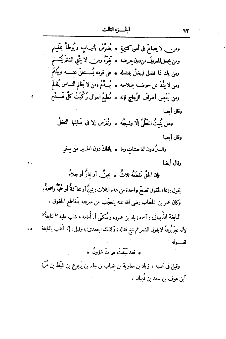 اسمه زياد بن عمرو، ويكنى أبا أمامة؛ غلب عليه «النابغة» لأنه عبر برهة لا يقول الشعر ثم نبغ فقاله؛ وكذلك الجعدىّ؛ وقيل: إنما لقّب بالنابغة لقوله