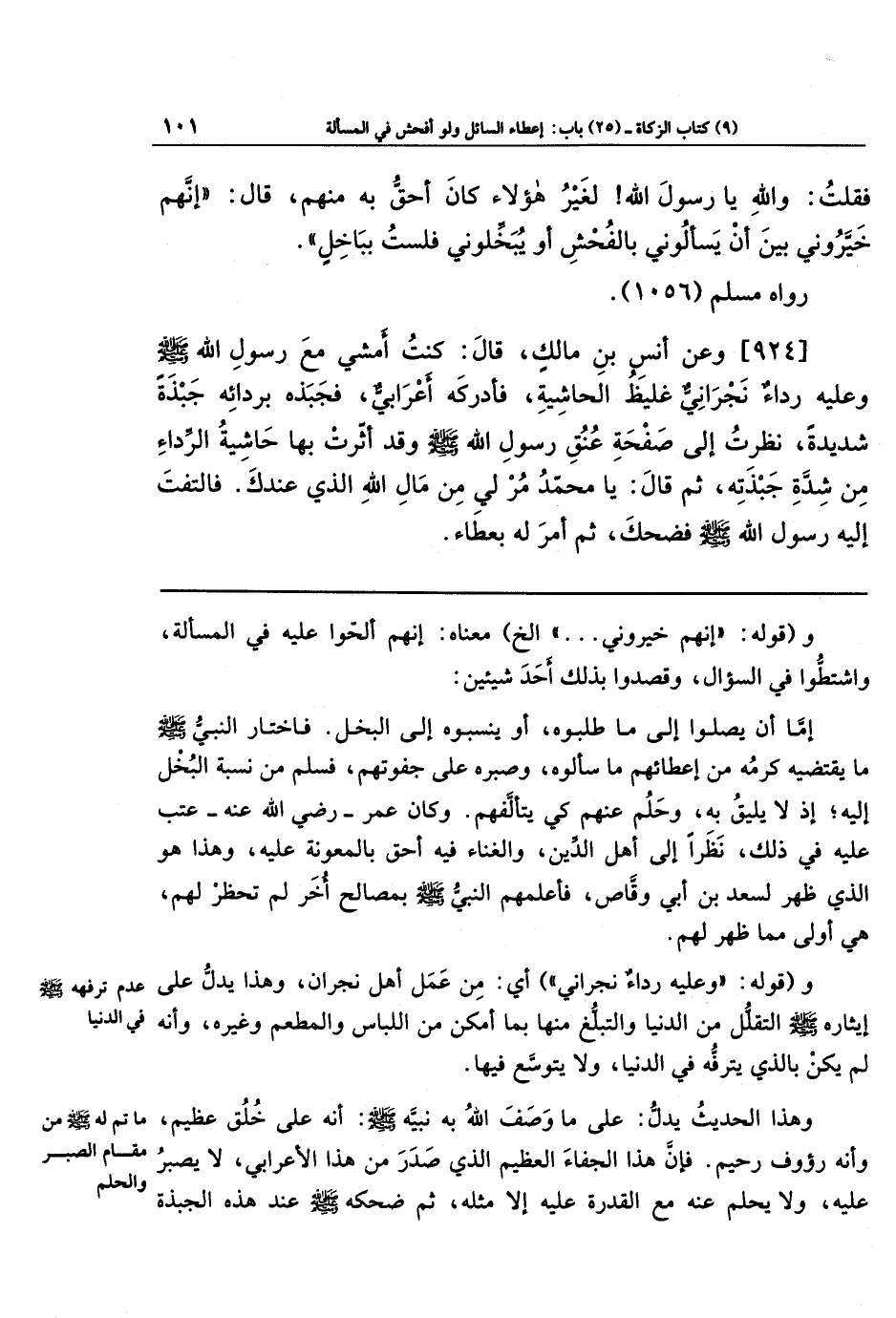 [924] وَعَن أَنَسِ بنِ مَالِكٍ قَالَ: كُنتُ أَمشِي مَعَ رَسُولِ اللهِ - صلى الله عليه وسلم - وَعَلَيهِ رِدَاءٌ نَجرَانِيٌّ غَلِيظُ الحَاشِيَةِ، فَأَدرَكَهُ أَعرَابِيٌّ، فَجَبَذَهُ بِرِدَائِهِ جَبذَةً شَدِيدَةً، نَظَرتُ إِلَى صَفحَةِ عُنُقِ رَسُولِ اللهِ - صلى الله عليه وسلم - وَقَد أَثَّرَت بِهَا حَاشِيَةُ الرِّدَاءِ مِن شِدَّةِ جَبذَتِهِ، ثُمَّ قَالَ: يَا مُحَمَّدُ مُر لِي مِن مَالِ اللهِ الَّذِي عِندَكَ. فَالتَفَتَ إِلَيهِ رَسُولُ اللهِ - صلى الله عليه وسلم - فَضَحِكَ، ثُمَّ أَمَرَ لَهُ بِعَطَاءٍ.