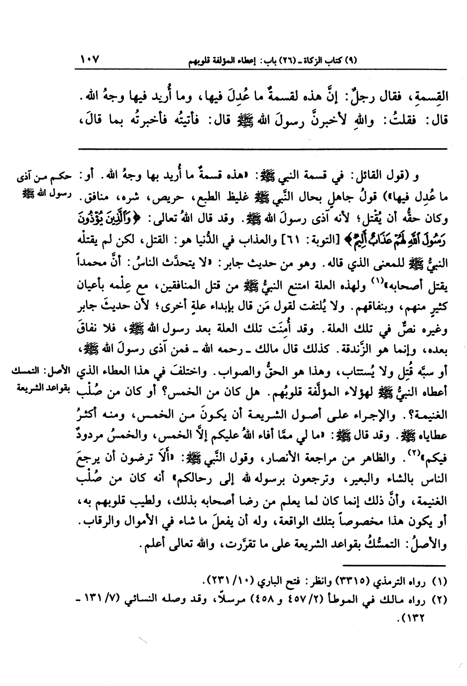 وقول القائل: في قسمة النبي - صلى الله عليه وسلم -: هذه قسمة ما أريد بها وجه الله، أو: ما عدل فيها؛ قول جاهل بحال النبي - صلى الله عليه وسلم -، غليظ الطبع، حريص، شره، منافق. وكان حقه أن يُقتل؛ لأنه آذى رسول الله - صلى الله عليه وسلم -، وقد قال الله تعالى: {وَالَّذِينَ يُؤذُونَ رَسُولَ اللَّهِ لَهُم عَذَابٌ أَلِيمٌ} والعذاب في الدنيا هو: القتل، لكن لم يقتله النبي - صلى الله عليه وسلم - للمعنى الذي قاله، وهو من حديث جابر: (لا يتحدّث الناس: أن محمدًا يقتل أصحابه) (¬1)، ولهذه العلة امتنع النبي - صلى الله عليه وسلم - من قتل المنافقين، مع علمه بأعيان كثير منهم، وبنفاقهم. ولا يلتفت لقول من قال بإبداء علة أخرى؛ لأن حديث جابر وغيره نصٌّ في تلك العلة، وقد أُمِنت تلك العلة بعد رسول الله - صلى الله عليه وسلم -، فلا نفاق بعده، وإنما هو الزندقة، كذلك قال مالك - رحمه الله -، فمن رسول الله - صلى الله عليه وسلم -، أو سبّه قتل ولا يستتاب، وهذا هو الحق والصواب.