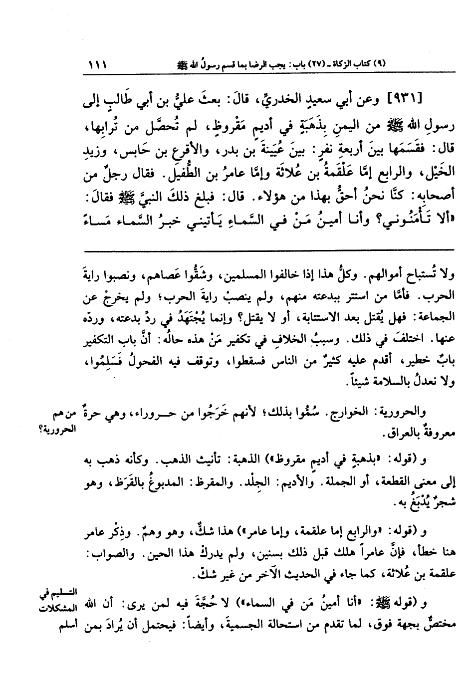 [931] وَعَن أَبِي سَعِيدٍ الخُدرِيَّ قَالَ: بَعَثَ عَلِيُّ بنُ أَبِي طَالِبٍ إِلَى رَسُولِ اللهِ - صلى الله عليه وسلم - من اليَمَنِ بِذَهَبَةٍ فِي أَدِيمٍ مَقرُوظٍ، لَم تُحَصَّل مِن تُرَابِهَا قَالَ: فَقَسَمَهَا بَينَ أَربَعَةِ نَفَرٍ: بَينَ عُيَينَةَ بنِ بدر، وَالأَقرَعِ بنِ حَابِسٍ، وَزَيدِ الخَيلِ، وَالرَّابِعُ إِمَّا عَلقَمَةُ بنُ عُلاثَةَ، وَإِمَّا عَامِرُ بنُ الطُّفَيلِ، فَقَالَ رَجُلٌ مِن أَصحَابِهِ: كُنَّا نَحنُ أَحَقَّ بِهَذَا مِن هَؤُلاءِ، قَالَ: فَبَلَغَ ذَلِكَ النَّبِيَّ - صلى الله عليه وسلم - فَقَالَ: (أَلا تَأمَنُونِي؟ وَأَنَا أَمِينُ مَن فِي السَّمَاءِ يَأتِينِي خَبَرُ السَّمَاءِ مَسَاءً