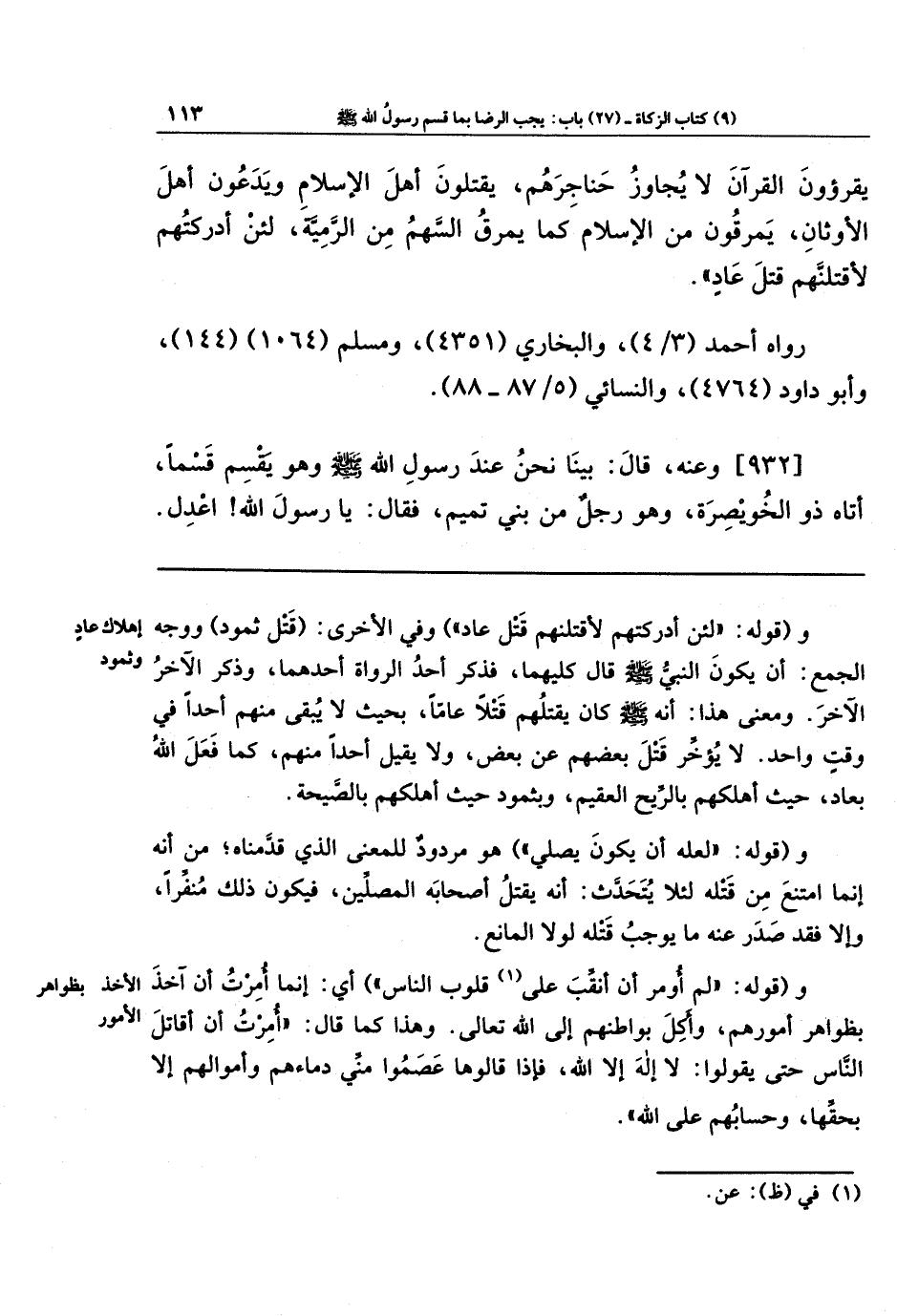 يَقرَءُونَ القُرآنَ لا يُجَاوِزُ حَنَاجِرَهُم، يَقتُلُونَ أَهلَ الإِسلامِ وَيَدَعُونَ أَهلَ الأَوثَانِ، يَمرُقُونَ مِنَ الإِسلامِ كَمَا يَمرُقُ السَّهمُ مِنَ الرَّمِيَّةِ، لَئِن أَدرَكتُهُم لأَقتُلَنَّهُم قَتلَ عَادٍ).