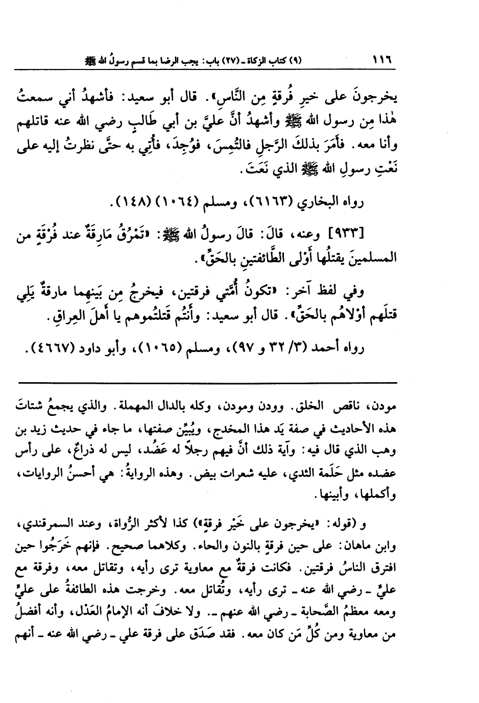 يَخرُجُونَ عَلَى خَيرِ فُرقَةٍ مِنَ النَّاسِ). قَالَ أَبُو سَعِيدٍ: فَأَشهَدُ أَنِّي سَمِعتُ هَذَا مِن رَسُولِ اللهِ - صلى الله عليه وسلم - وَأَشهَدُ أَنَّ عَلِيَّ بنَ أَبِي طَالِبٍ رضي الله عنه قَاتَلَهُم وَأَنَا مَعَهُ، فَأَمَرَ بِذَلِكَ الرَّجُلِ فَالتُمِسَ فَوُجِدَ، فَأُتِيَ بِهِ حَتَّى نَظَرتُ إِلَيهِ عَلَى نَعتِ رَسُولِ اللهِ - صلى الله عليه وسلم - الَّذِي نَعَتَ.