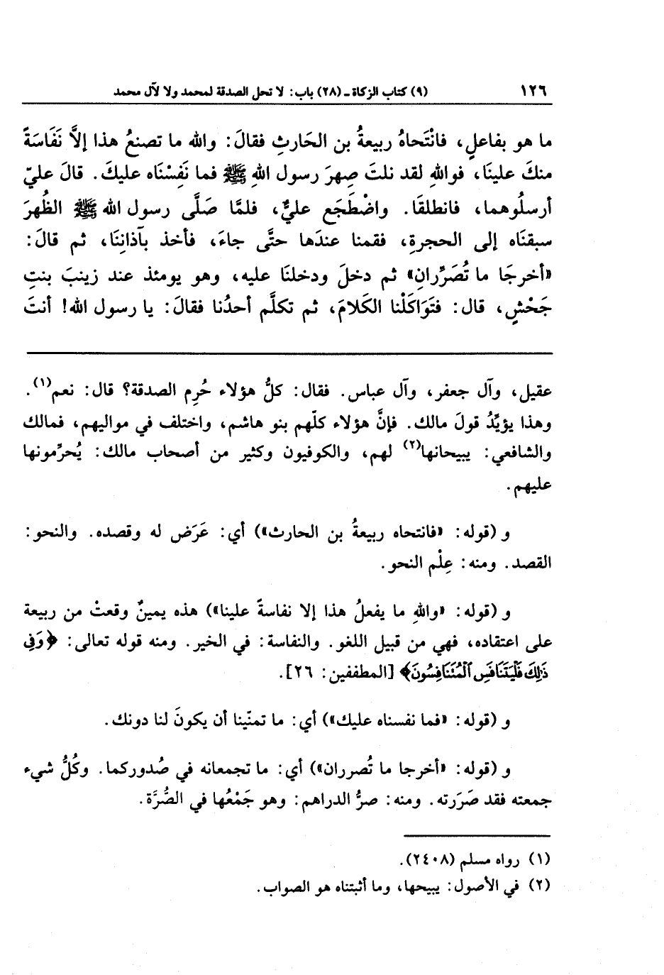 مَا هُوَ بِفَاعِلٍ، فَانتَحَاهُ رَبِيعَةُ بنُ الحَارِثِ، فَقَالَ: وَاللهِ مَا تَصنَعُ هَذَا إِلا نَفَاسَةً مِنكَ عَلَينَا، فَوَاللهِ لَقَد نِلتَ صِهرَ رَسُولِ اللهِ - صلى الله عليه وسلم - فَمَا نَفِسنَاهُ عَلَيكَ. قَالَ عَلِيٌّ أَرسِلُوهُمَا فَانطَلَقَا. وَاضطَجَعَ عَلِيٌّ، فَلَمَّا صَلَّى رَسُولُ اللهِ - صلى الله عليه وسلم - الظُّهرَ سَبَقنَاهُ إِلَى الحُجرَةِ، فَقُمنَا عِندَهَا حَتَّى جَاءَ، فَأَخَذَ بِآذَانِنَا، ثُمَّ قَالَ: (أَخرِجَا مَا تُصَرِّرَانِ) ثُمَّ دَخَلَ وَدَخَلنَا عَلَيهِ، وَهُوَ يَومَئِذٍ عِندَ زَينَبَ بِنتِ جَحشٍ، قَالَ: فَتَوَاكَلنَا الكَلامَ، ثُمَّ تَكَلَّمَ أَحَدُنَا فَقَالَ: يَا رَسُولَ اللهِ! أَنتَ